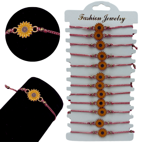 Set 12 Bratari Martisor Floarea Soarelui, cu margele, snur reglabilSetul include 12 bratari martisor cu un design inspirat de floarea soarelui, simbol al soarelui si al primaverii. Fiecare bratara este decorata cu margele colorate si are un snur reglabil, potrivit pentru orice dimensiune. Aceste bratari sunt perfecte pentru a fi oferite ca daruri sau pentru revanzare, aducand un strop de energie pozitiva si veselie