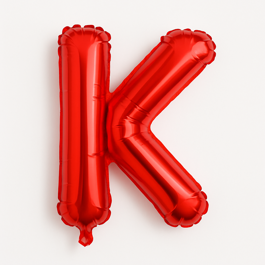 Balon folie litera K, culoare rosu metalizat, ideal pentru decoruri festive la aniversari, petreceri tematice, botezuri, nunti sau sesiuni foto. Se poate combina cu alte litere pentru a forma nume, mesaje sau initiale personalizate.