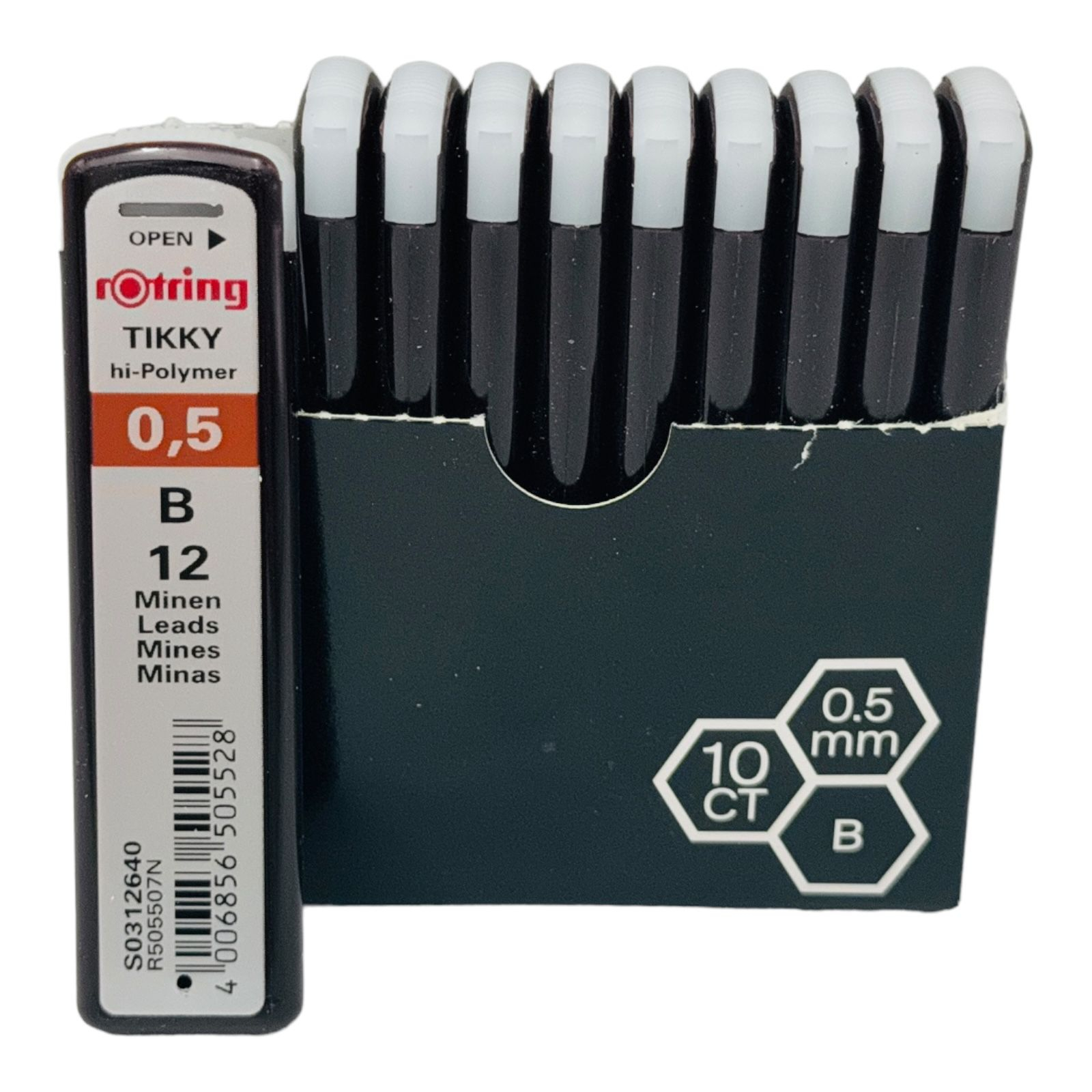 Set de 12 tuburi cu mine grafit Rotring 0.5mm, grad B, special concepute pentru creioane mecanice. Rezerve de calitate superioara, ideale pentru scris fin, desen tehnic, schite si ilustratii. Compatibile cu majoritatea creioanelor mecanice de 0.5mm. Textura moale si uniforma pentru trasaturi precise si confort la utilizare.