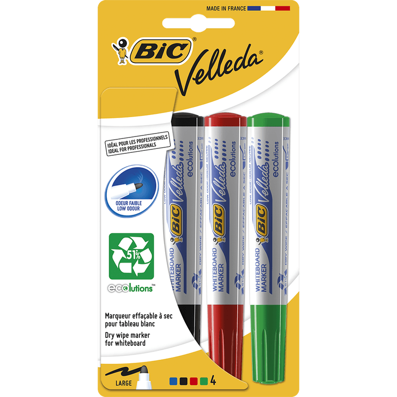 Setul de 4 Markere pentru tabla Bic Vellada include culori vibrante (rosu, verde, albastru si negru), perfecte pentru prezentari, notite si explicatii vizuale. Cerneala usor de sters si varful de calitate asigura o scriere clara si vizibila, fara pete. Ideal pentru utilizare pe table albe, acest set de markere este esential pentru birou, scoala sau sali de conferinte. Disponibil in pachet convenabil, acest set de markere este alegerea ideala pentru orice activitate care necesita scriere pe suprafete albe.