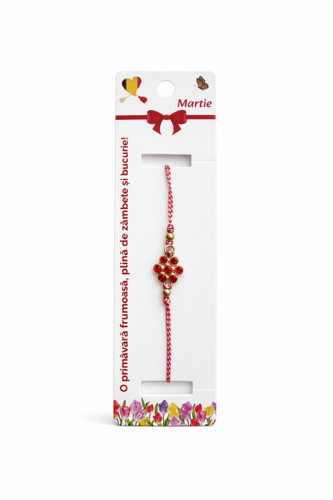 setul include 12 Bratari Martisor tip bratara realizat pe snur traditional alb-rosu, simbol al primaverii si al norocului. Elementul central este o floare eleganta formata din cristale rosii stralucitoare, montate pe suport metalic auriu, oferind un aspect rafinat si feminin. Designul floral este echilibrat de bilute aurii laterale, care completeaza armonios modelul.