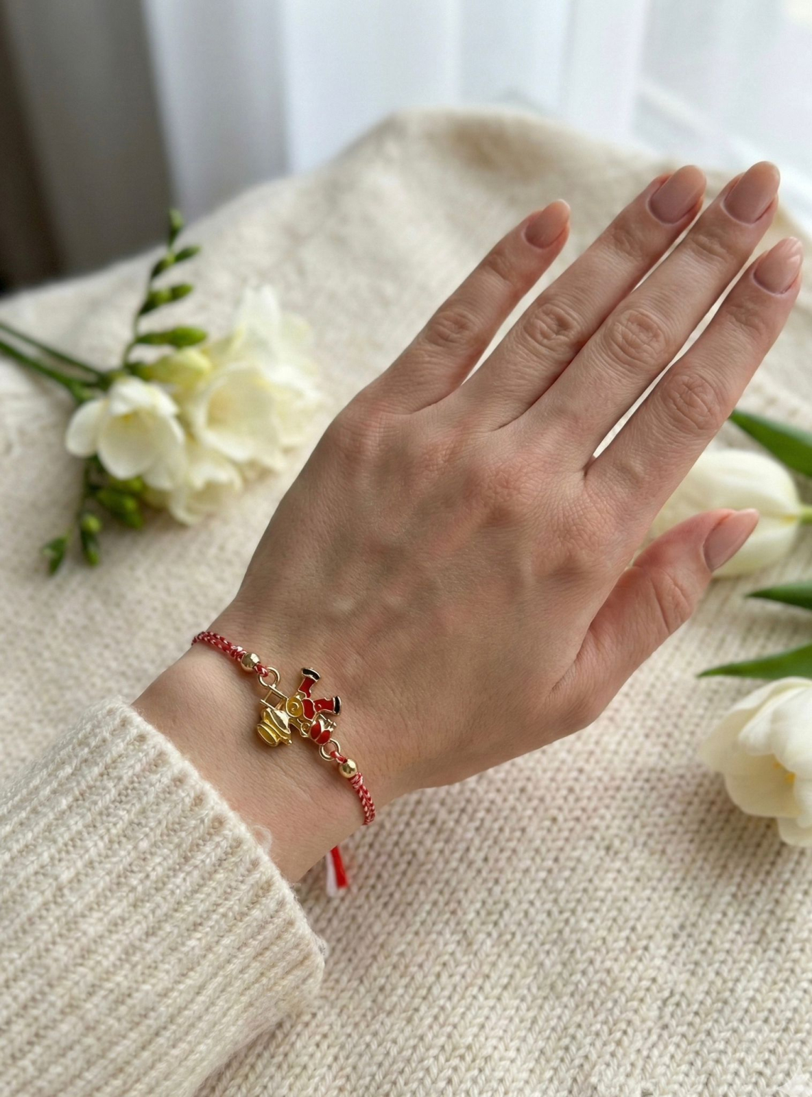 Setul contine 12 bratari martisor realizate cu snur traditional rasucit rosu-alb, prevazut cu sistem de reglare, potrivit pentru diferite dimensiuni ale incheieturii. Fiecare bratara este decorata cu un accesoriu metalic central reprezentand un cosar, simbol traditional al norocului, prosperitatii si reusitei.