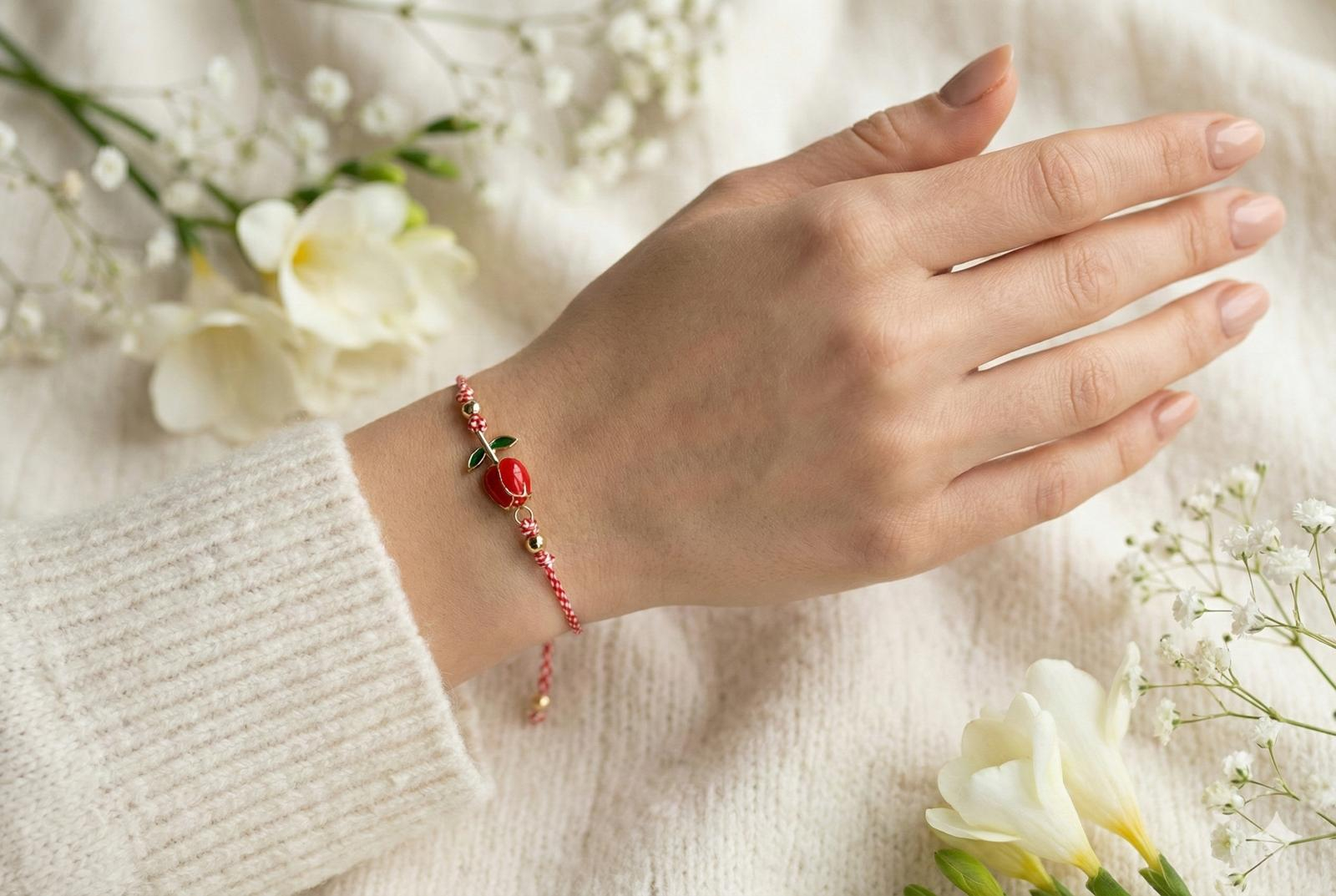 Fiecare bratara este realizata pe snur impletit rosu si alb, reglabil, adaptabil oricarei incheieturi. Elementul central este o lalea rosie stilizata, cu finisaj auriu si detalii fine in nuante de rosu si verde, simbol al primaverii, al iubirii, al elegantei si al noilor inceputuri. Laleaua este una dintre cele mai apreciate flori de primavara, asociata cu prospetimea, bucuria si renasterea naturii.