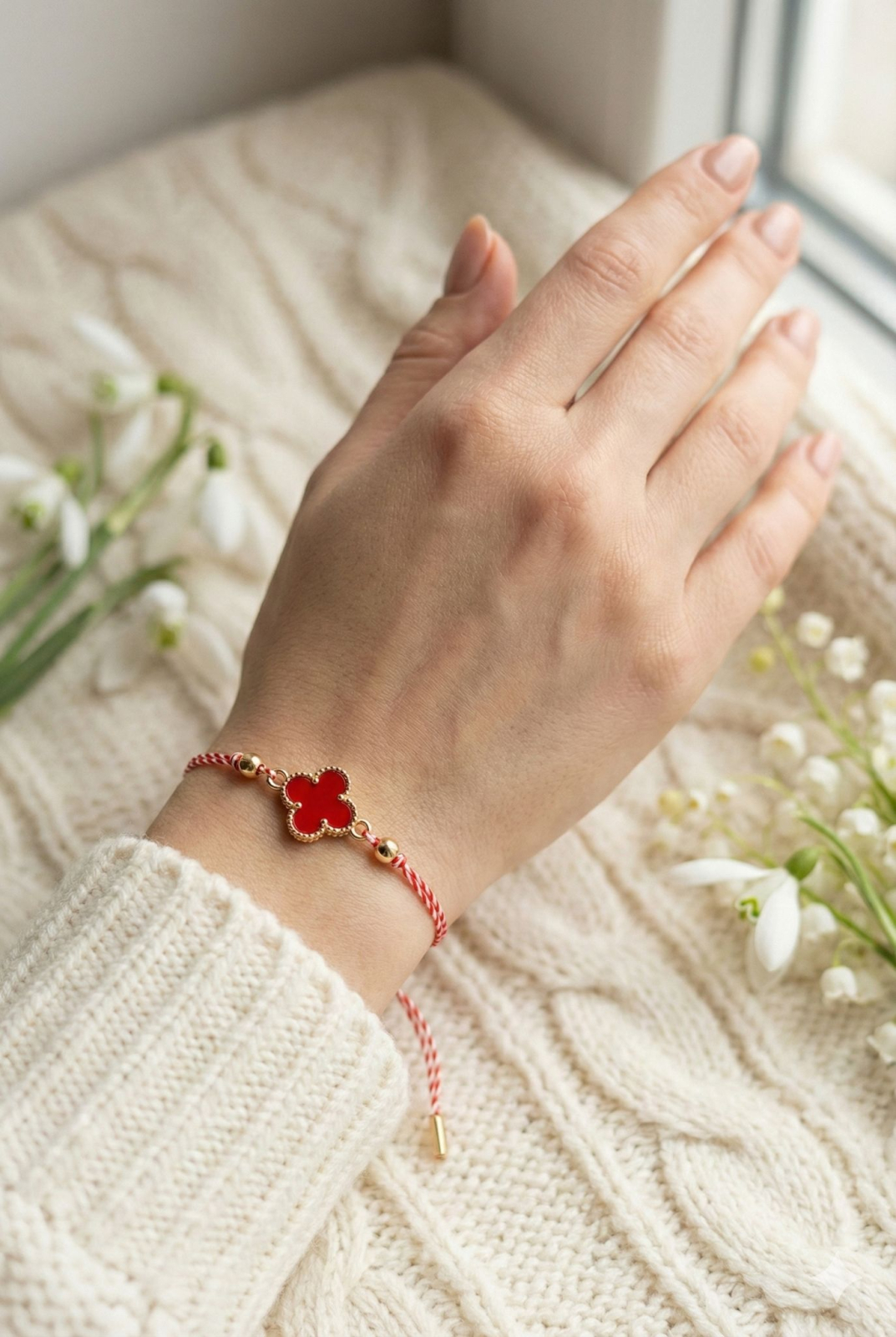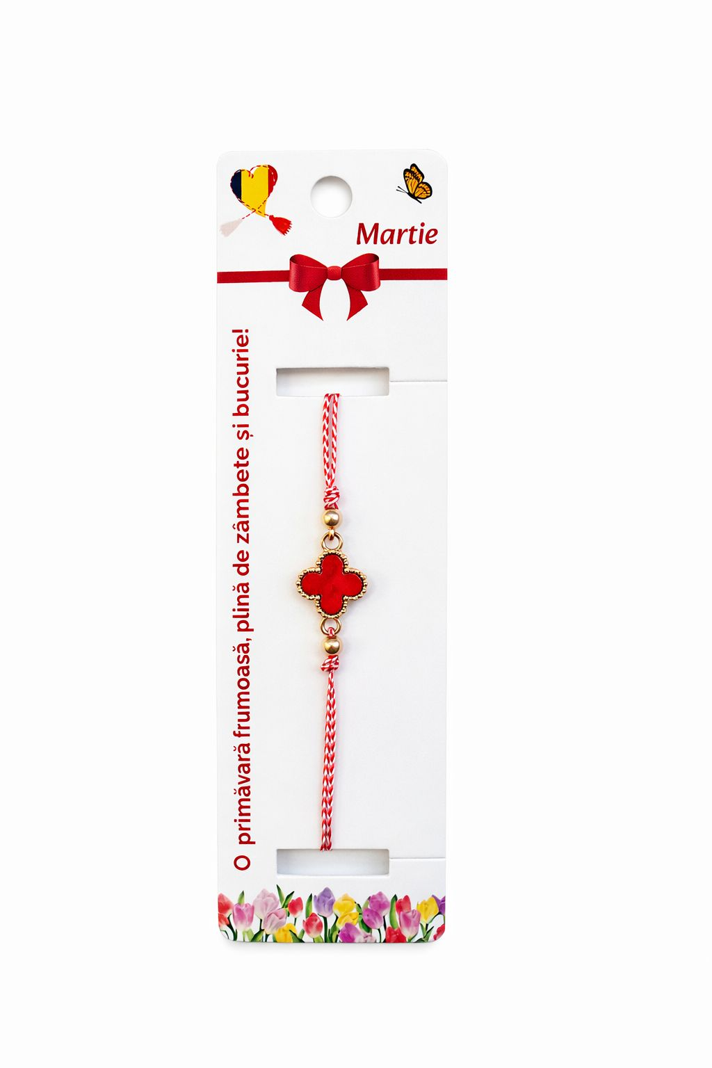Fiecare bratara este realizata pe snur impletit rosu si alb, reglabil, adaptabil diferitelor dimensiuni ale incheieturii. Elementul central este un trifoi decorativ de culoare rosie, cu margini aurii si finisaj atent realizat. Trifoiul este un simbol traditional al norocului, prosperitatii si protectiei, fiind asociat cu speranta, echilibrul si energia pozitiva. Culoarea rosie accentueaza ideea de vitalitate, iubire si forta interioara, fiind in armonie perfecta cu simbolistica martisorului.