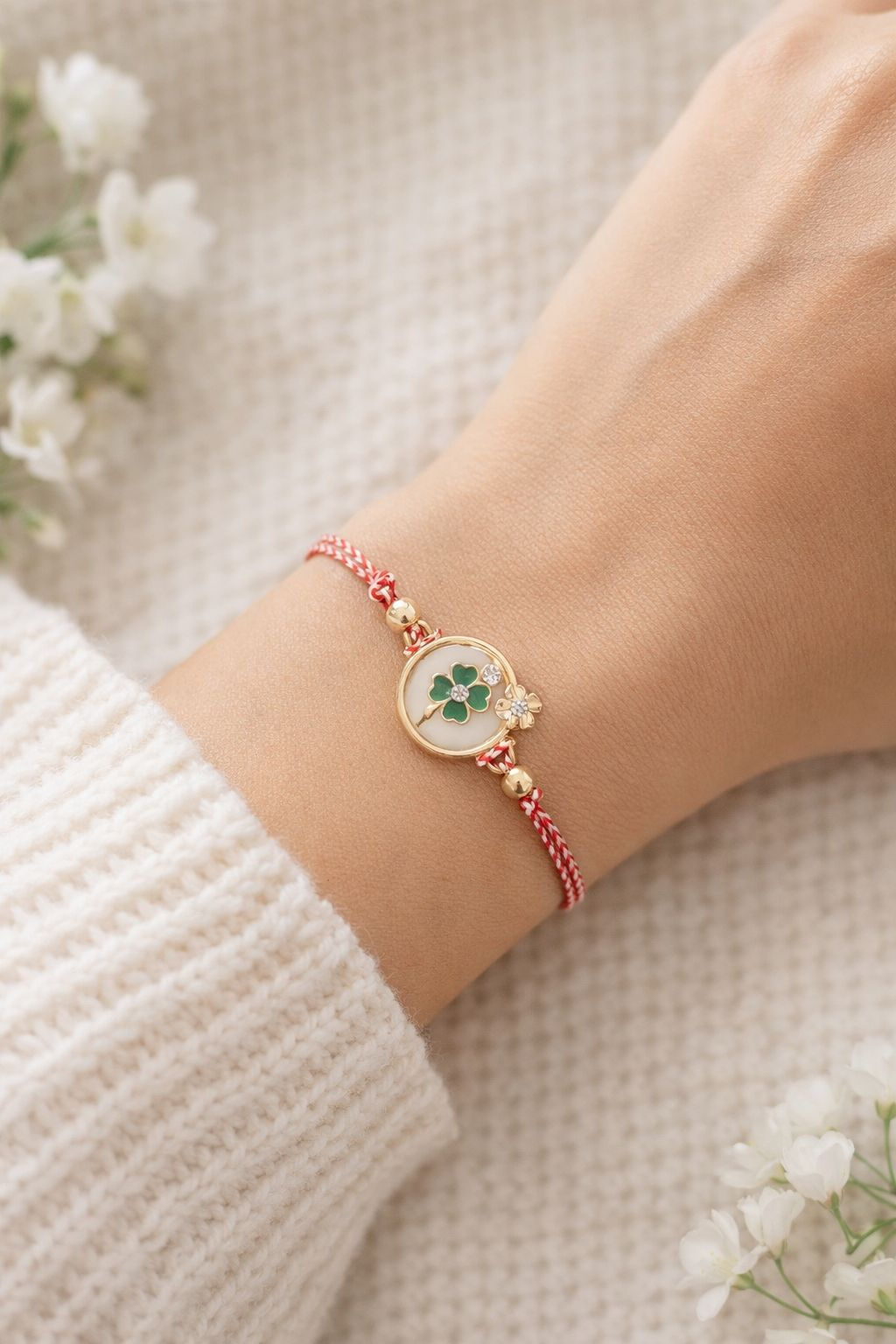 Fiecare bratara este realizata cu snur impletit rosu si alb, reglabil, care se adapteaza usor diferitelor dimensiuni ale incheieturii. Elementul central este un trifoi decorativ, incadrat intr-un cerc fin si completat de mici detalii metalice, oferind un aspect elegant si feminin. Trifoiul este cunoscut ca simbol al norocului, prosperitatii si sperantei, fiind asociat cu dorinte implinite, energie pozitiva si inceputuri favorabile.