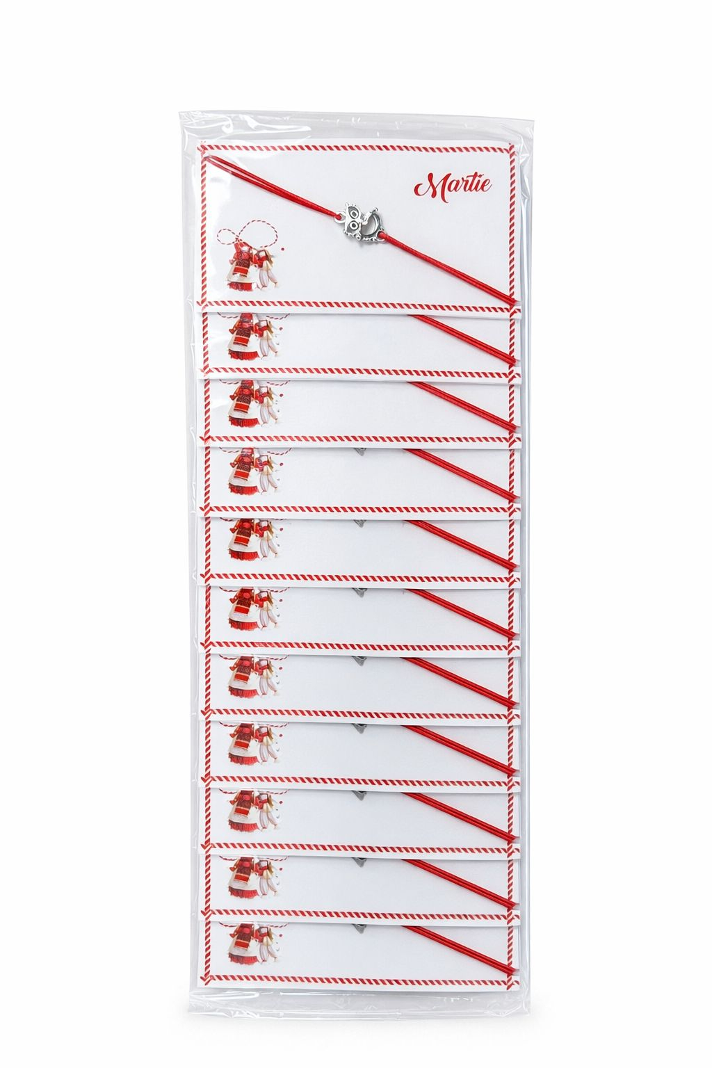 Set de 24 bratari martisor cu snur rosu si charm metalic bufnita, ambalate individual pe cartonase 8x5 cm cu ilustratie traditionala si text „Martie”. Bufnita simbolizeaza intelepciunea, protectia si claritatea mentala, fiind un cadou inspirat pentru 1 martie. Bratarile sunt reglabile, potrivite pentru copii si adulti, ideale pentru scoli, birouri sau familie. Design handmade, cu valoare estetica si simbolica — cadou primavara cu semnificatie.