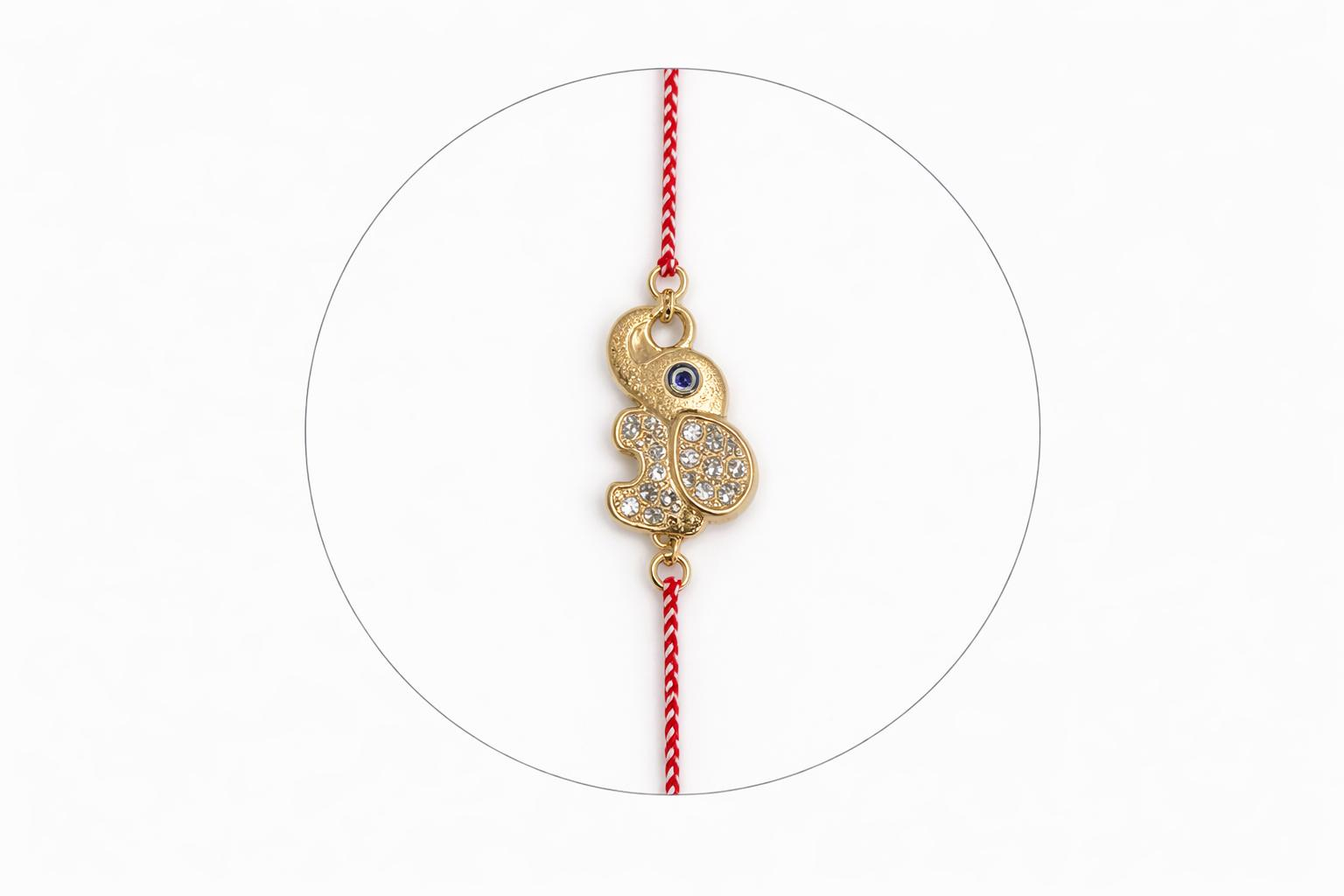Elementul central al bratarii este un elefant decorativ realizat din material metalic, cu finisaj auriu, decorat cu strasuri stralucitoare care reflecta lumina si ofera un aspect elegant. Detaliile fine ale simbolului evidentiaza designul atent realizat, transformand fiecare bratara intr-un accesoriu decorativ deosebit.