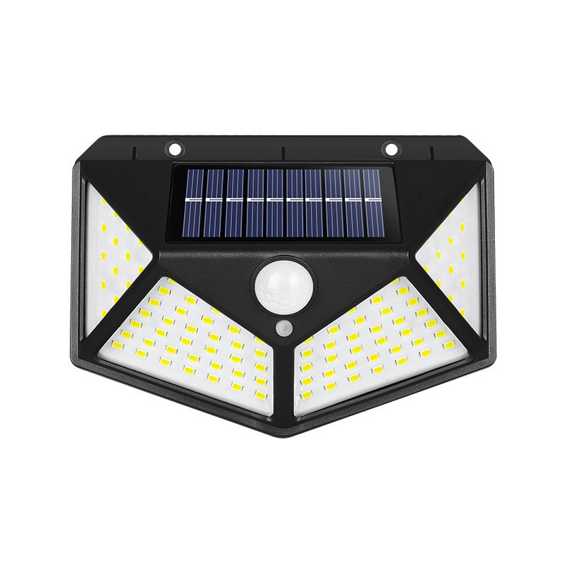 Lampa cu incarcare solara si senzor de miscare pentru exterior, 100 LED cu distanta de inductie, montaj pe perete, fara cabluri, cu 4 fete