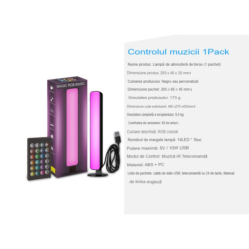 Lampa de Birou, Flippy, RGB Colorat, 14 LED, Putere 5V, Telecomanda cu 24 de Taste, Cablu USB, Negru, 25.5x4x3.5cm