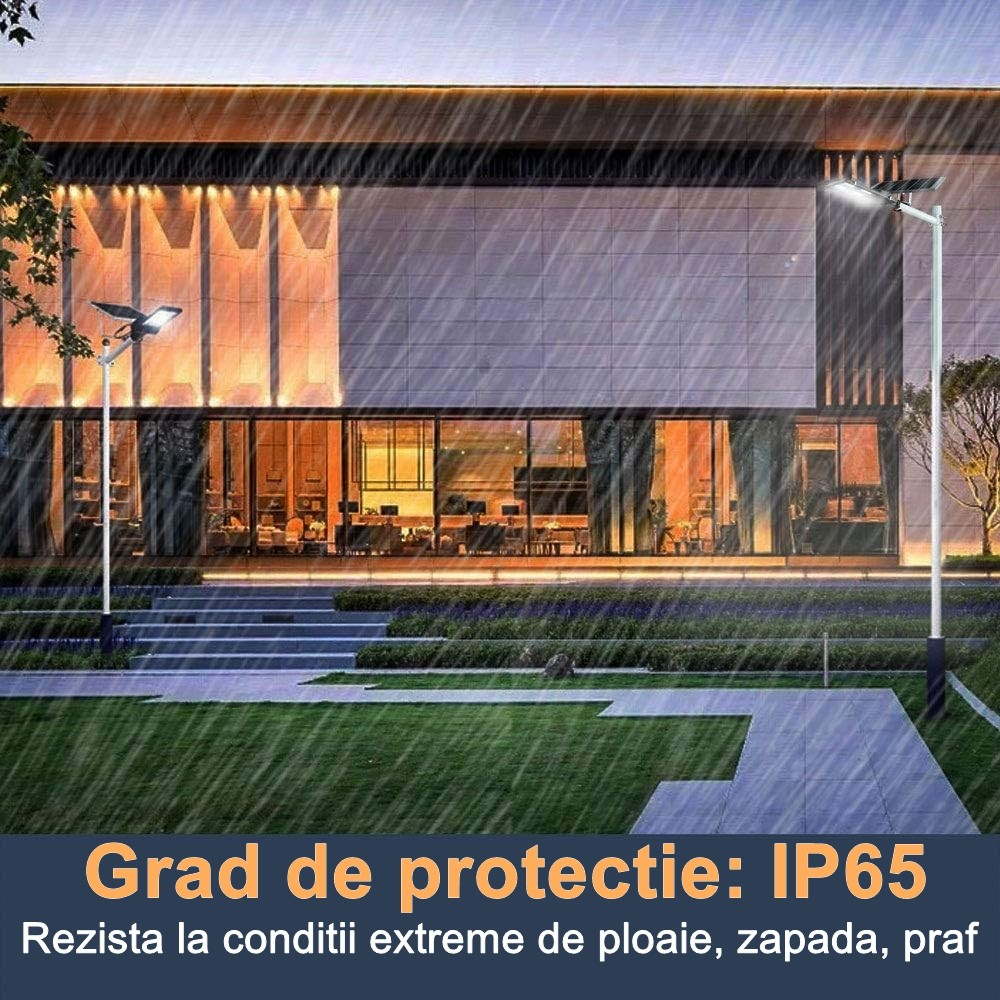 Informatii utile: Forma:Dreptunghi, Tip intrerupator:Senzor de lumina, Material:ABS, Tip lumina:Rece, Autonomie:12 h, Durata de incarcare:10 h, Tip acumulator:Li-Fe, Continut pachet:1 x Lampa solara 1 x Telecomanda 1 x Panou solar 1 x Kit montare, Putere:80 W, Greutate:5.5 kg, Inaltime:6.5 cm, Lungime:38.6 cm, Latime:13.3 cm, Flux luminos:7200 lm, Numar bucati:1, Finisaj:Lucios, Culoare:Negru, Tip montare:Prin fixare, Caracteristici cheie:Rezistenta la apa, Utilizat pentru:Gradina, Clasa de protectie:IP65, Temperatura culoare:6500 k