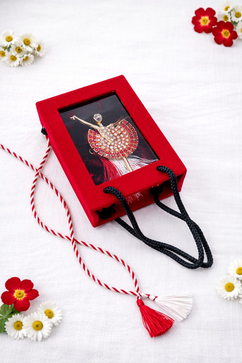 Brosa eleganta in forma de balerina, realizata in nuanta aurie si decorata cu strasuri albe stralucitoare si accente rosii intense, care creeaza un contrast rafinat si plin de expresivitate. Designul balerinei simbolizeaza gratie, eleganta si pasiune, fiind potrivit pentru un martisor cu impact vizual si semnificatie puternica. Combinatia cromatica alb si rosu reflecta traditia primaverii, norocul si energia pozitiva, transformand brosa intr-un accesoriu versatil si feminin. Produsul este prezentat intr-o cutie deosebita din catifea rosie, cu interior negru si fereastra transparenta, realizata in forma de punga de cadou si decorata cu fundita aurie la inchidere, oferind o prezentare premium, ideala pentru a fi oferita cadou. Martisorul traditional alb rosu cu ciucure este inclus.