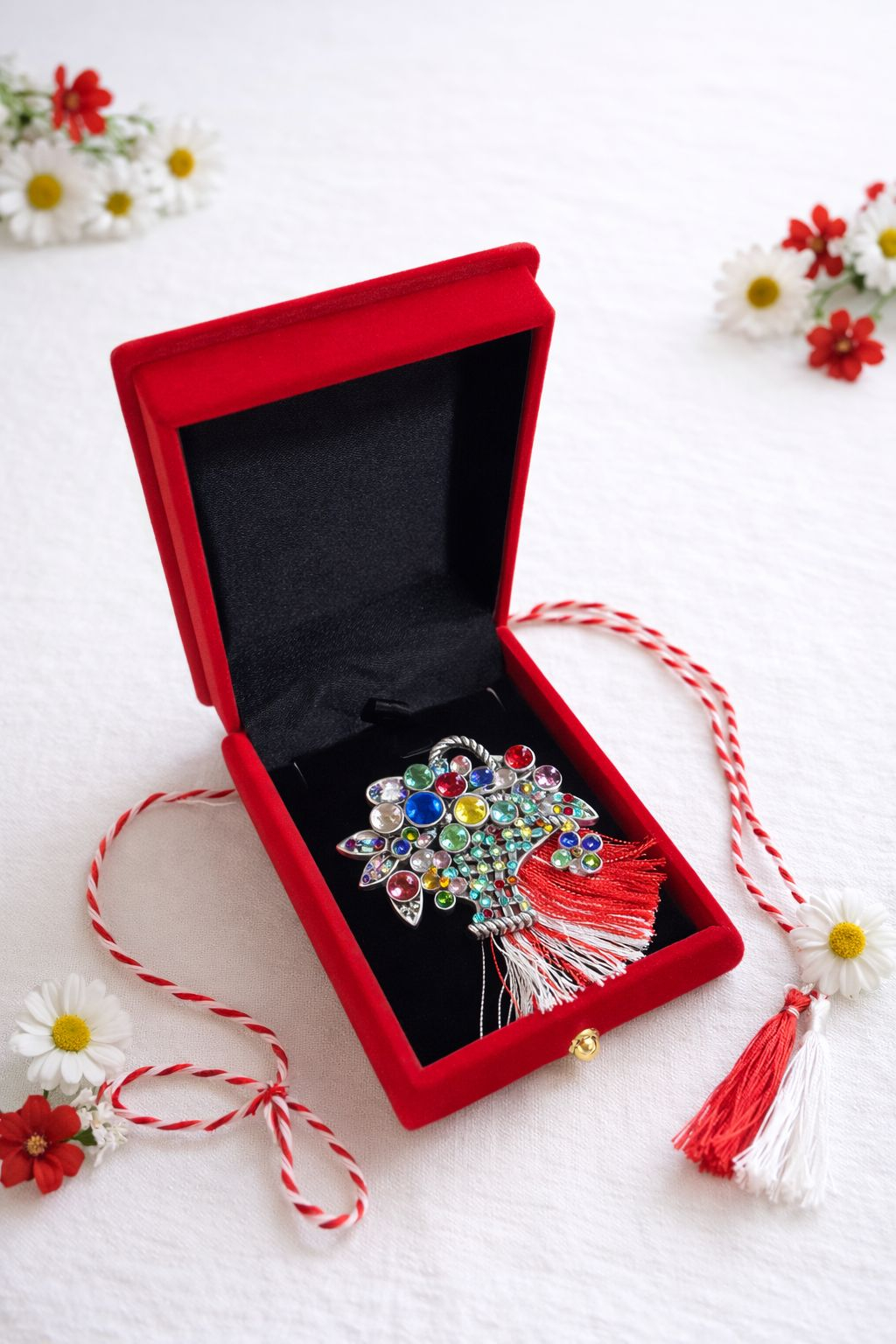 Brosa decorativa in forma de cosulet, realizata in finisaj argintiu si impodobita cu strasuri multicolore ce ofera un aspect vesel si sofisticat. Designul simbolizeaza belsugul, norocul si bucuria, fiind o alegere inspirata pentru tinute elegante sau pentru a adauga un accent colorat unei tinute casual. Brosa este prezentata intr-o cutie de catifea rosie tip cufar, cu textura reliefata pe partea superioara si interior negru, ideala pentru oferire cadou sau pastrare. Dimensiuni cutie: 8.5 x 6.5 x 3 cm.