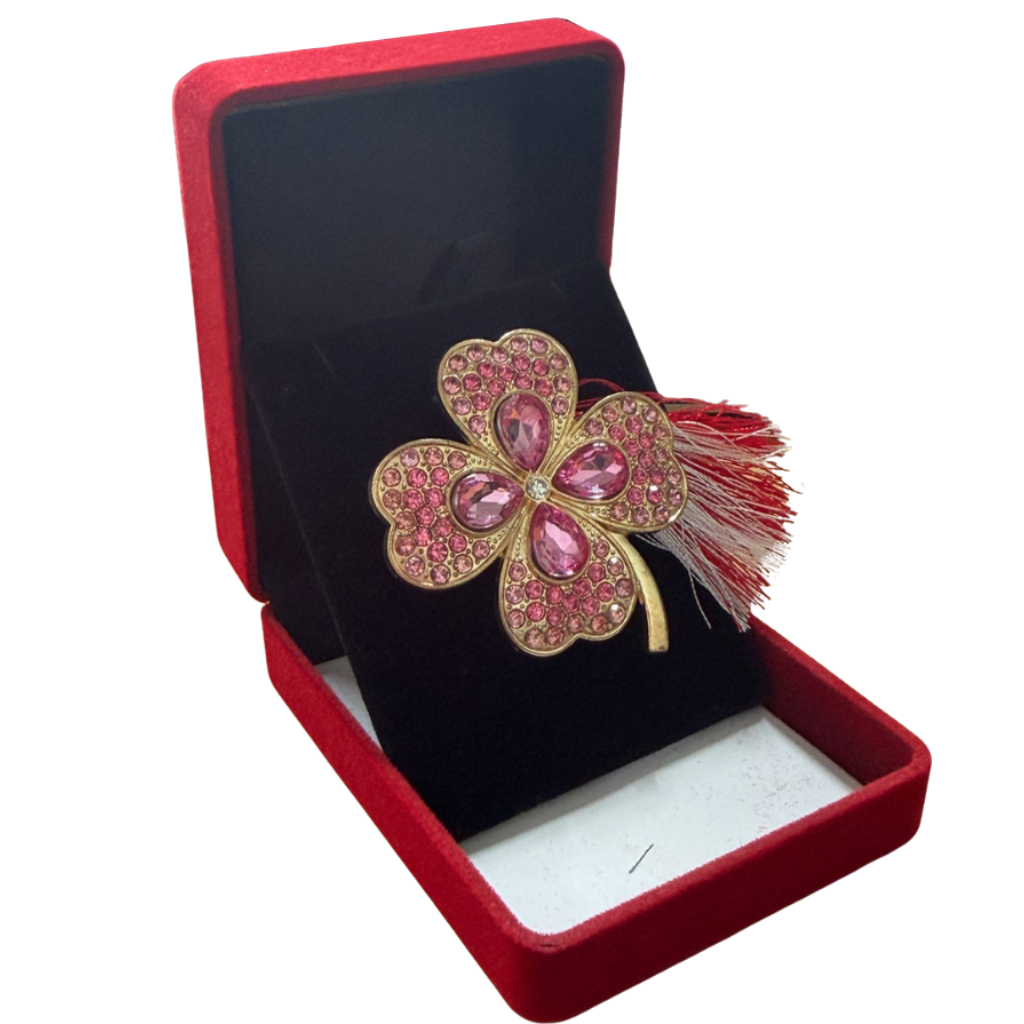 O brosa trifoi roz martisor poate aduce o energie aparte, ca si cum ar purta un strop de noroc intr-o nuanta delicata de roz. Petalele sale, decorate cu strasuri stralucitoare si pietre mari in forma de lacrima, creeaza un joc de lumina care atrage privirea din primul moment. Fiecare detaliu este sculptat cu grija, de la conturul auriu pana la modul in care fiecare piatra pare asezata pentru a spune o poveste feminina si plina de optimism.