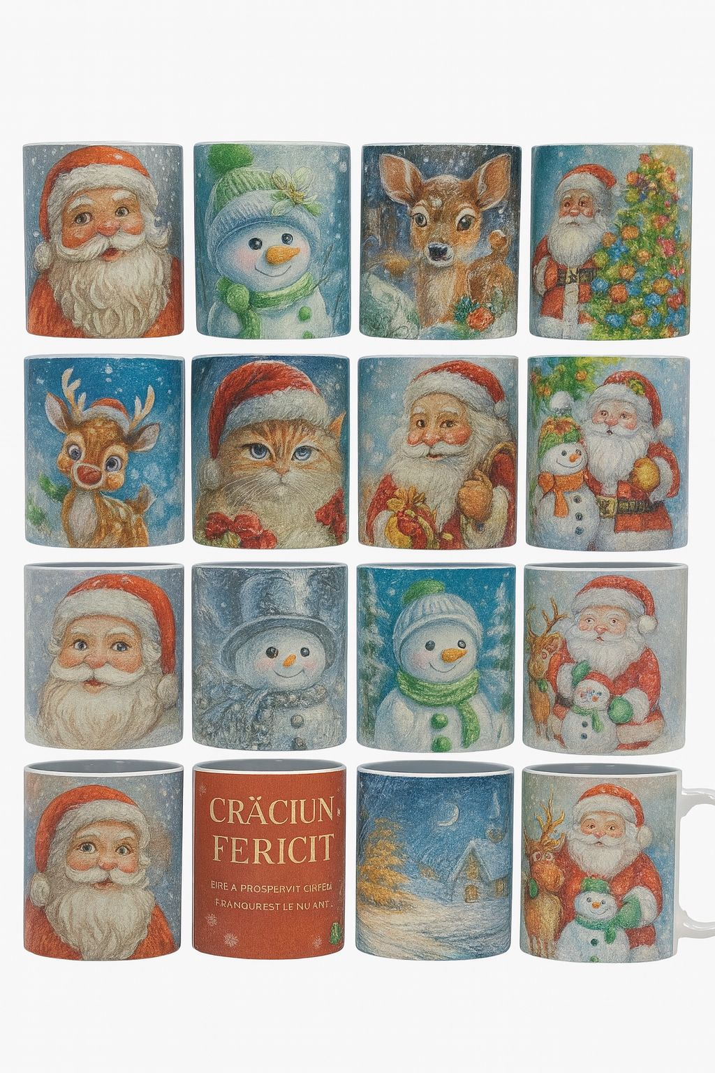 Set format din 12 cani de Craciun, mix random, perfecte pentru cadouri, birou, familie sau evenimente tematice.