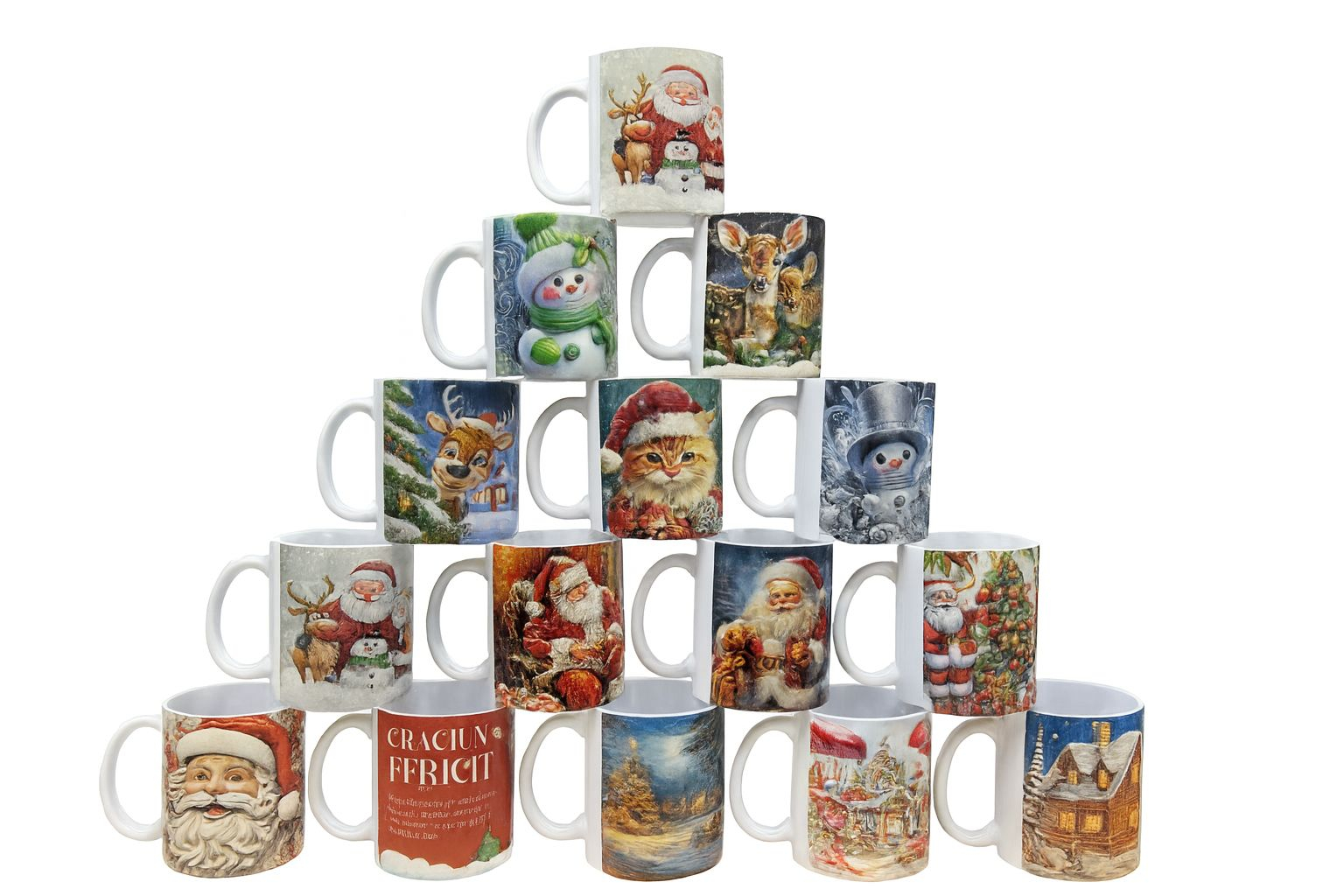 Cestile sunt realizate din ceramica premium, cu imprimeuri colorate si rezistente: Mos Craciun, reni, oameni de zapada, peisaje de iarna si alte personaje festive.