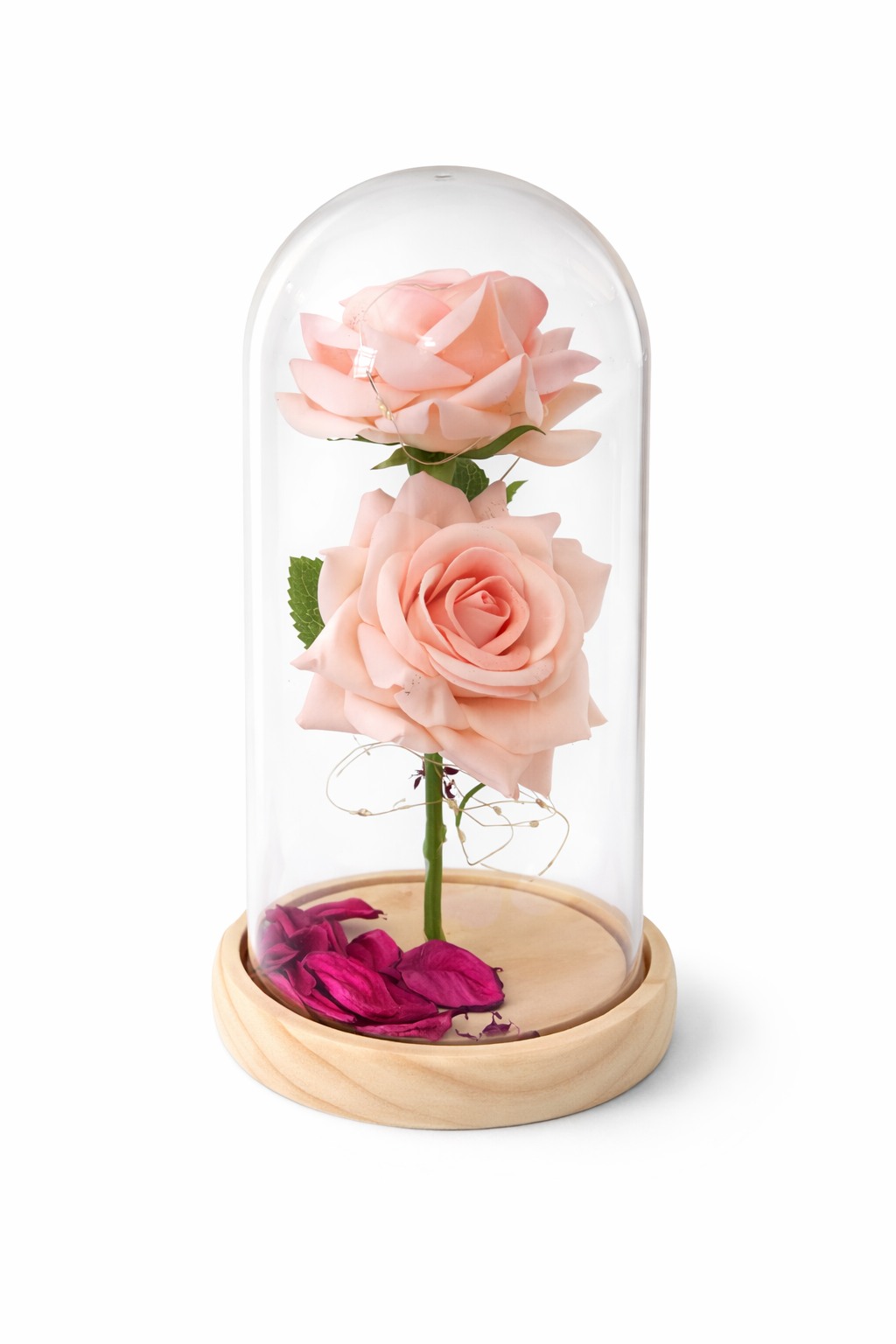 Trandafirii sunt amplasati intr-o cupola transparenta din plastic, asezata pe o baza solida din lemn natural, completata de lumini LED calde care creeaza o atmosfera intima si rafinata. Designul premium transforma acest produs intr-un cadou ideal pentru Valentine’s Day, aniversari, logodna sau surprize romantice.