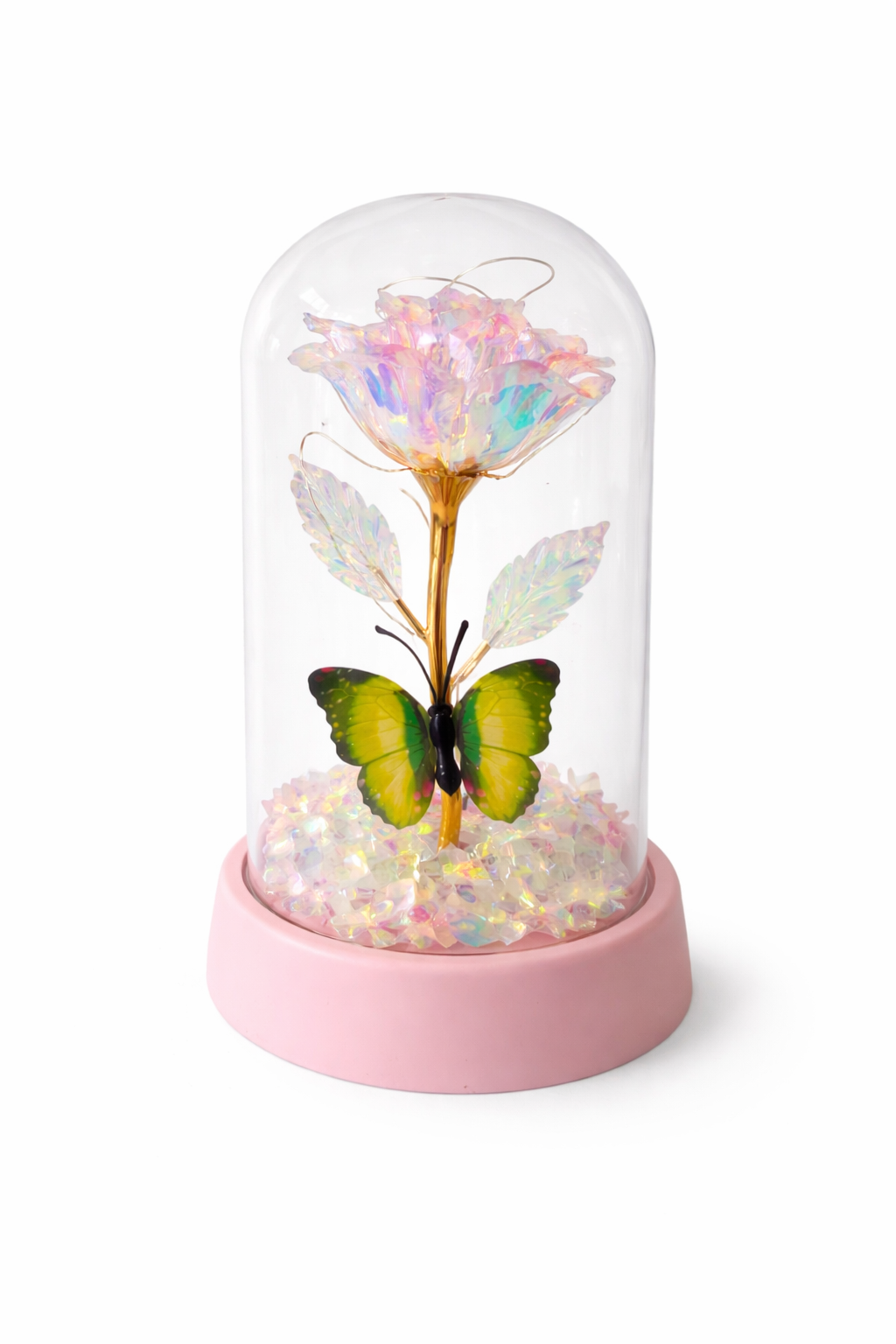 Cupola cu Trandafir Royal irizat si fluture galben este un cadou delicat si plin de emotie, creat special pentru momentele in care vrei sa spui „te iubesc” fara cuvinte. Trandafirul cu efect irizat capteaza lumina LED calda, oferind reflexii spectaculoase si un aspect elegant, deosebit.