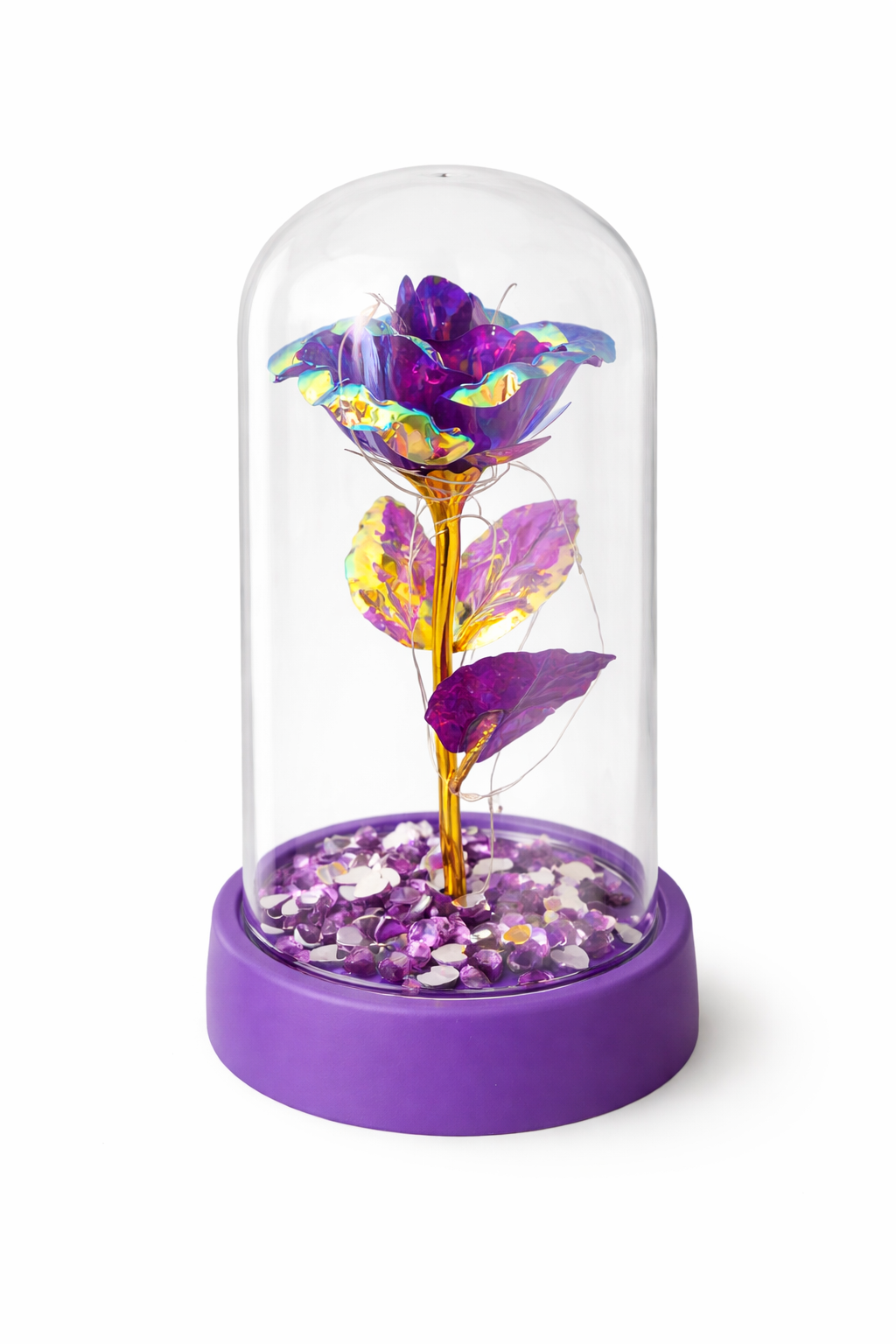 Aceasta cupola decorativa din plastic cu trandafir irizant mov este un cadou elegant si rafinat, potrivit pentru momente speciale si decor interior. Trandafirul are petale cu efect irizant in nuante mov, care reflecta lumina spectaculos, fiind montat pe o tulpina aurie ce adauga un plus de eleganta.