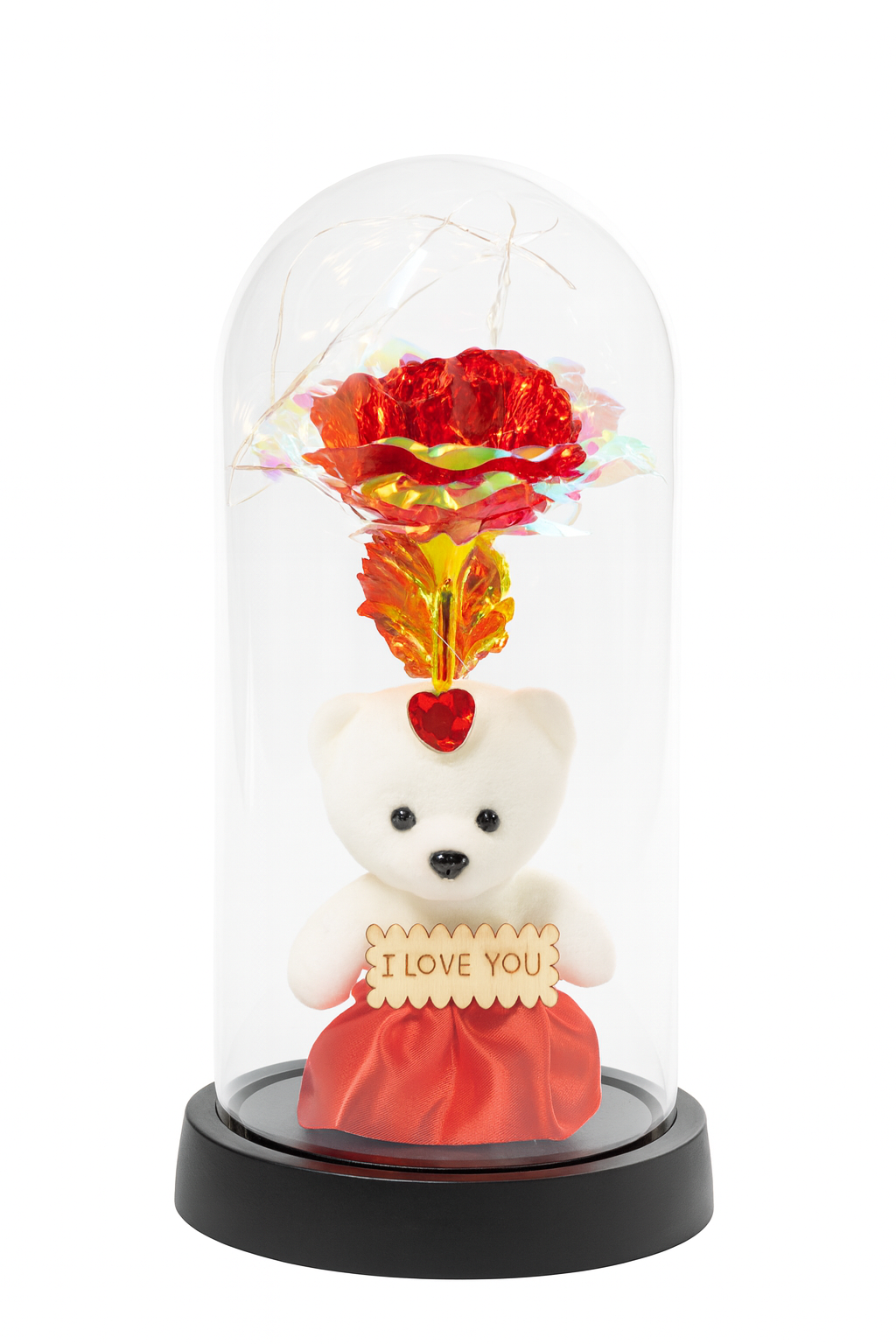 Cupola 22x11cm cu Ursulet Rosu Elegant si Trandafir Multicolor LED – Cadou Romantic