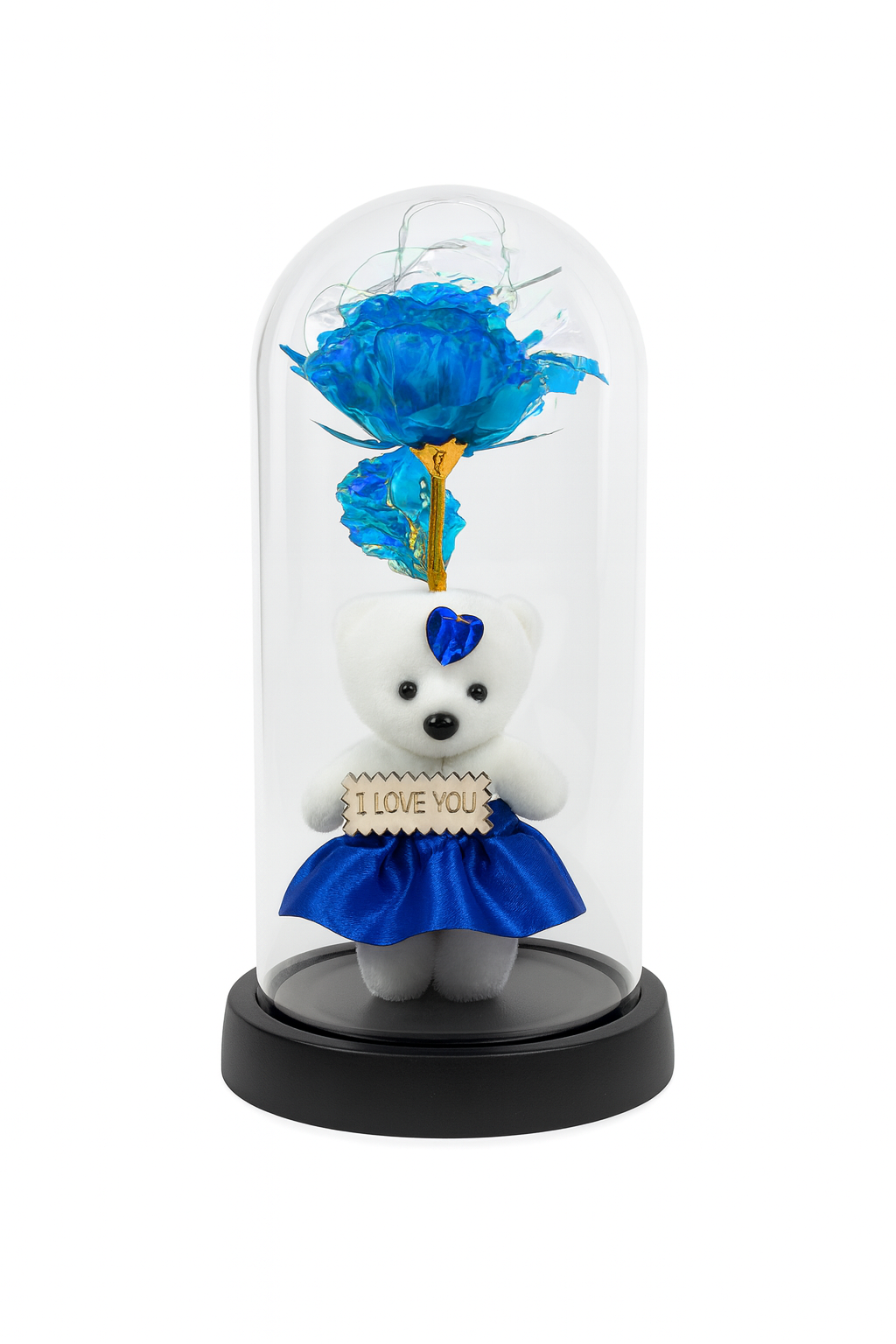 Ursuletul alb, cu rochita satinata bleu royal si inimioara stralucitoare, tine mesajul delicat "I LOVE YOU", accentuand sentimentul autentic de afectiune. Baza neagra ofera contrast si un look modern, premium, perfect pentru un cadou memorabil.