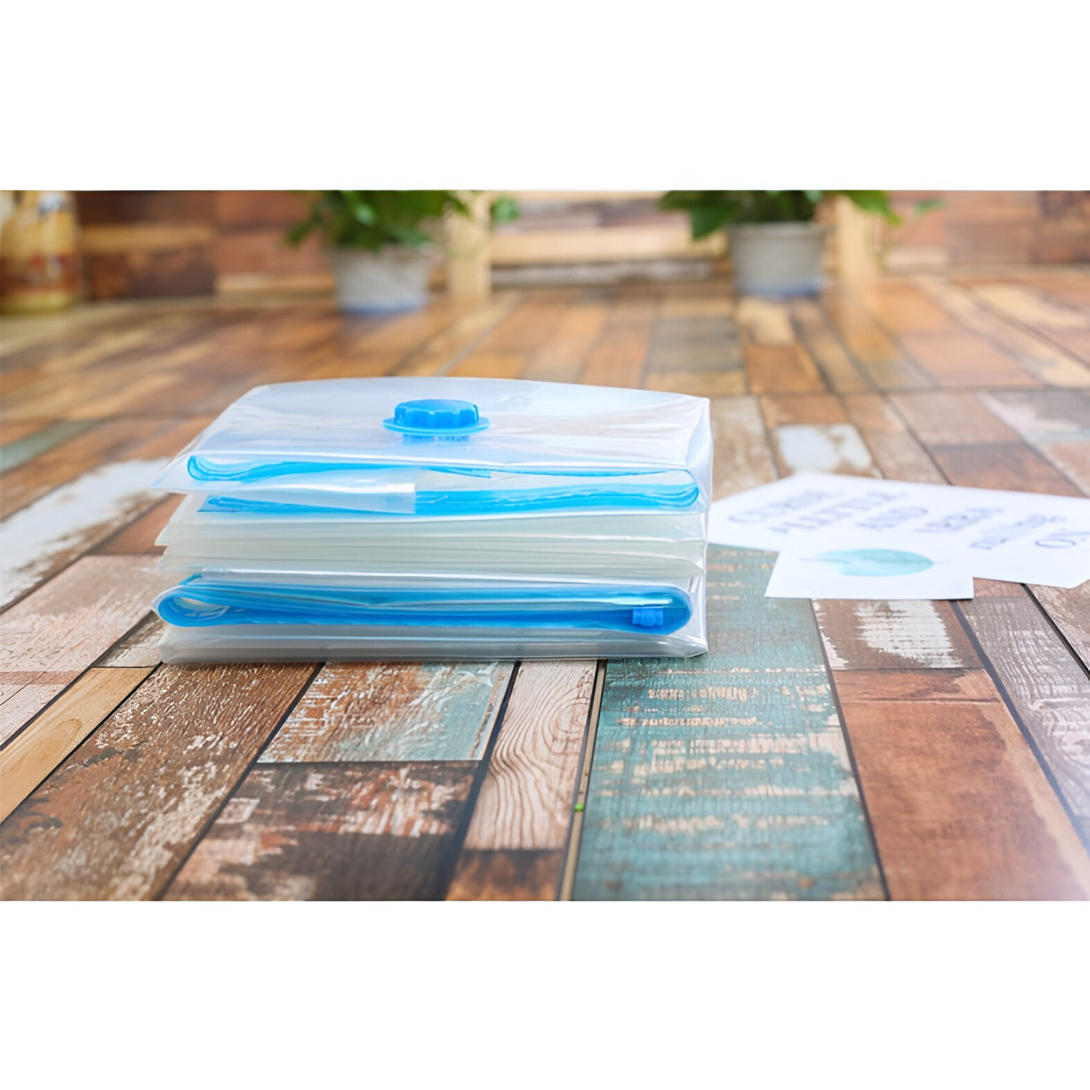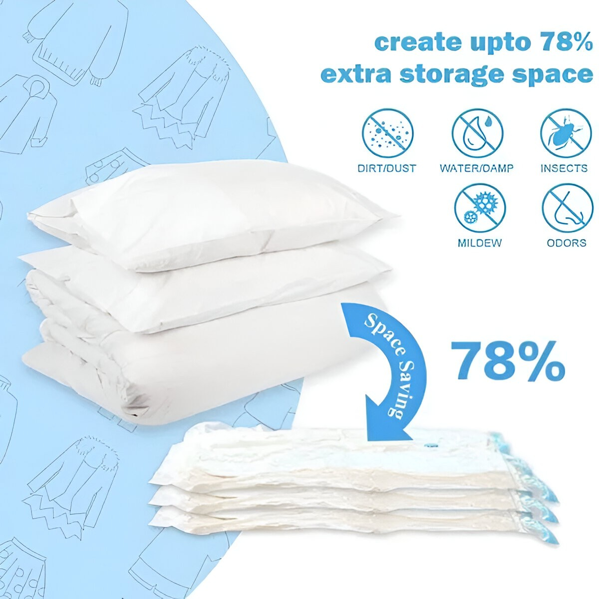 Puteți economisi până la 80% din spațiu utilizând pungi de vid, care sunt perfecte pentru toate nevoile dvs. de depozitare. Odată închise, pot fi depozitate cu ușurință sub pat, pe un raft sau sub un dulap.