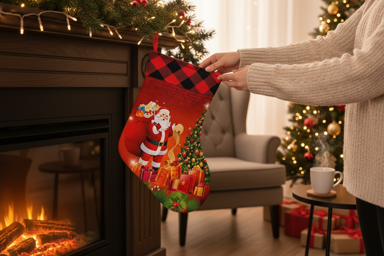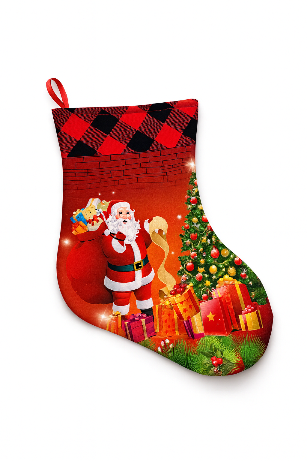 Partea superioara are un design tip carouri rosii si negre, oferind un aspect modern si rustic, ideal pentru decorul de iarna. Ciorapul este prevazut cu agațatoare rezistenta, astfel incat il poti atarna cu usurinta la semineu, pe perete, la brad sau pe usa.