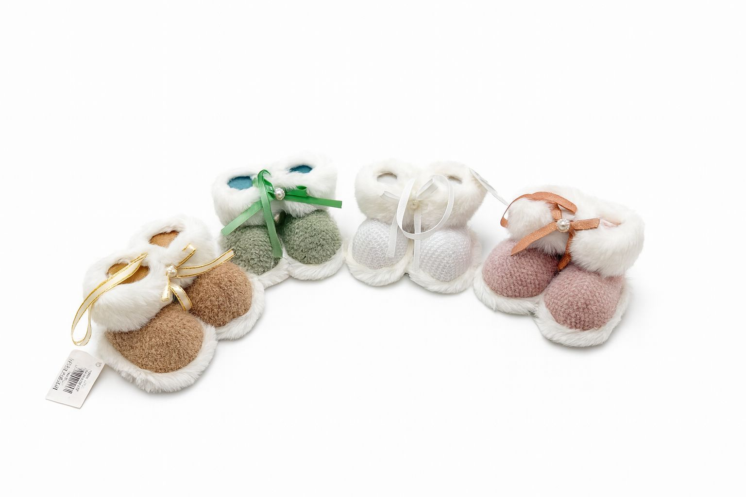 Decoratiune pentru brad in forma de pereche de botosei pentru bebelusi, realizata din plus moale si material textil pufos. Fiecare pereche este prevazuta cu panglica colorata si perluta decorativa, oferind un aspect delicat si elegant.