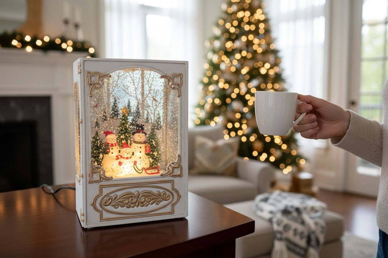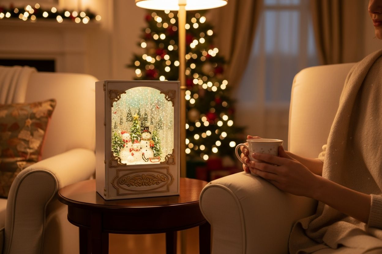 O decoratiune eleganta in forma de carte, perfecta pentru a aduce atmosfera magica a sarbatorilor in orice incapere. Scena de iarna surprinsa in interior, cu oameni de zapada si brad impodobit, este animata de un efect superb de ninsoare care se misca permanent, luminile LED calde si colindele integrate.