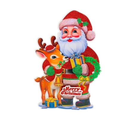 Sticker decorativ de Craciun cu efect 3D si sclipici, avand dimensiunea de 40x24 cm. Modelul il prezinta pe Mos Craciun intr-o postura vesela, alaturi de un ren adorabil, ambii inconjurati de cadouri si elemente festive de sezon.