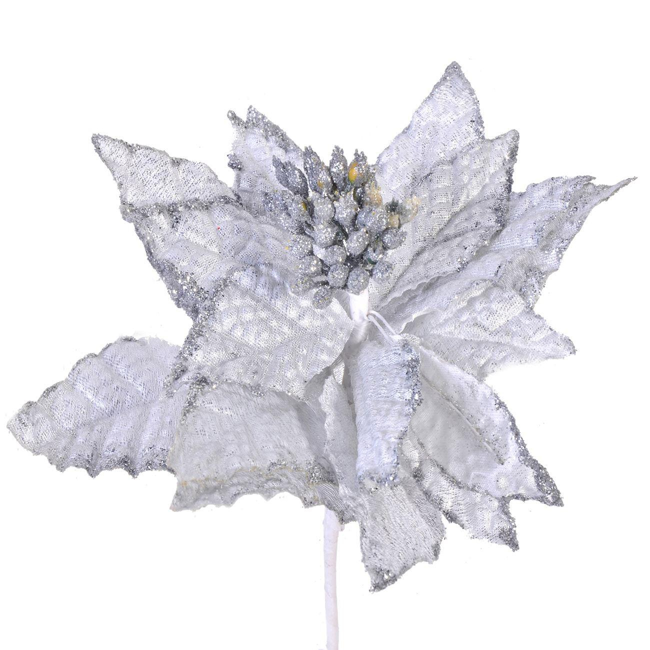 Floare de Crăciun decorativă (Poinsettia) – alb & argintiu, glitter