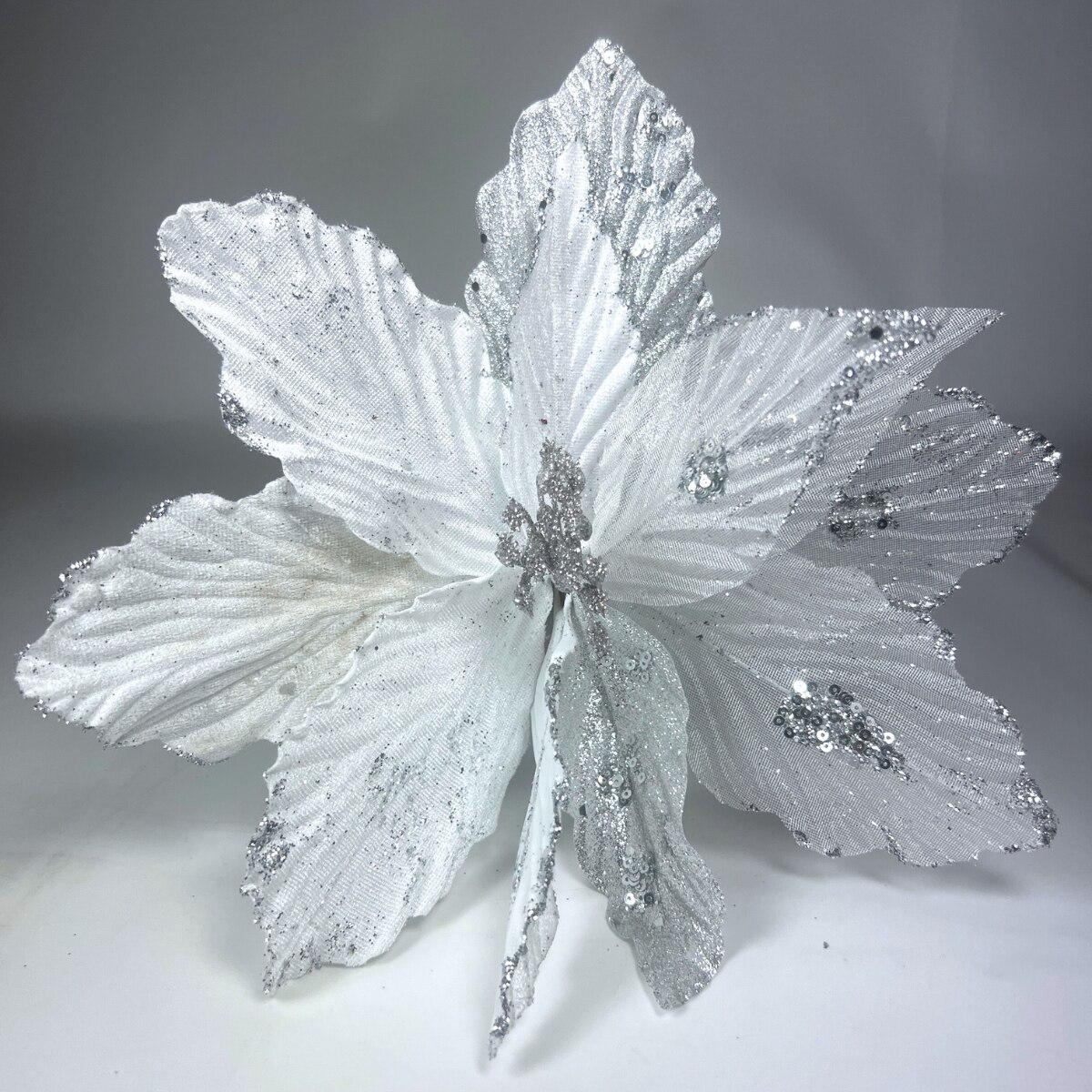 Floare artificială pentru brad și aranjamente, aspect elegant alb-argintiu, cu accente sclipitoare.