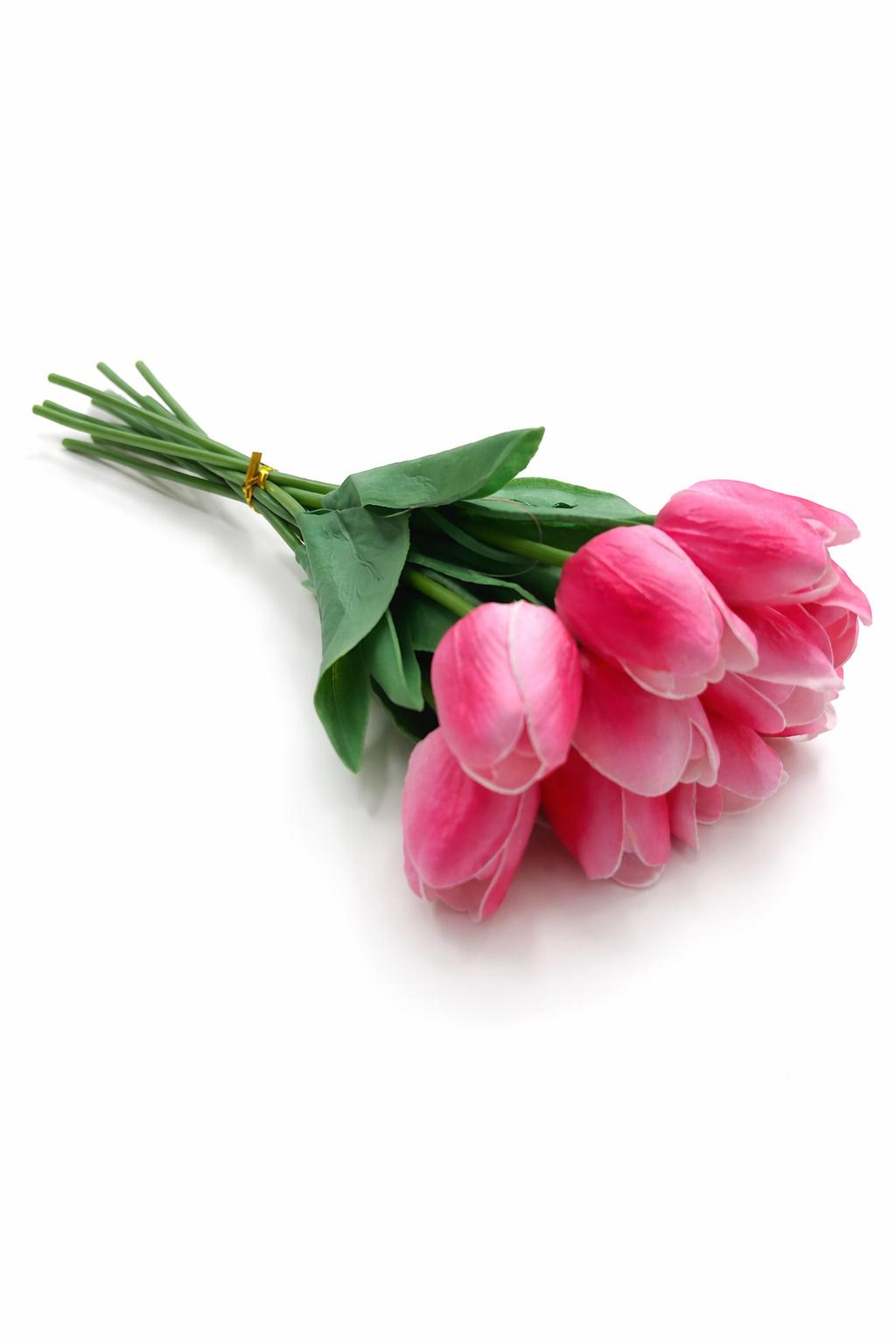 Set 10 lalele artificiale roz intens cu accente crem soft touch, fir individual, 33cm
