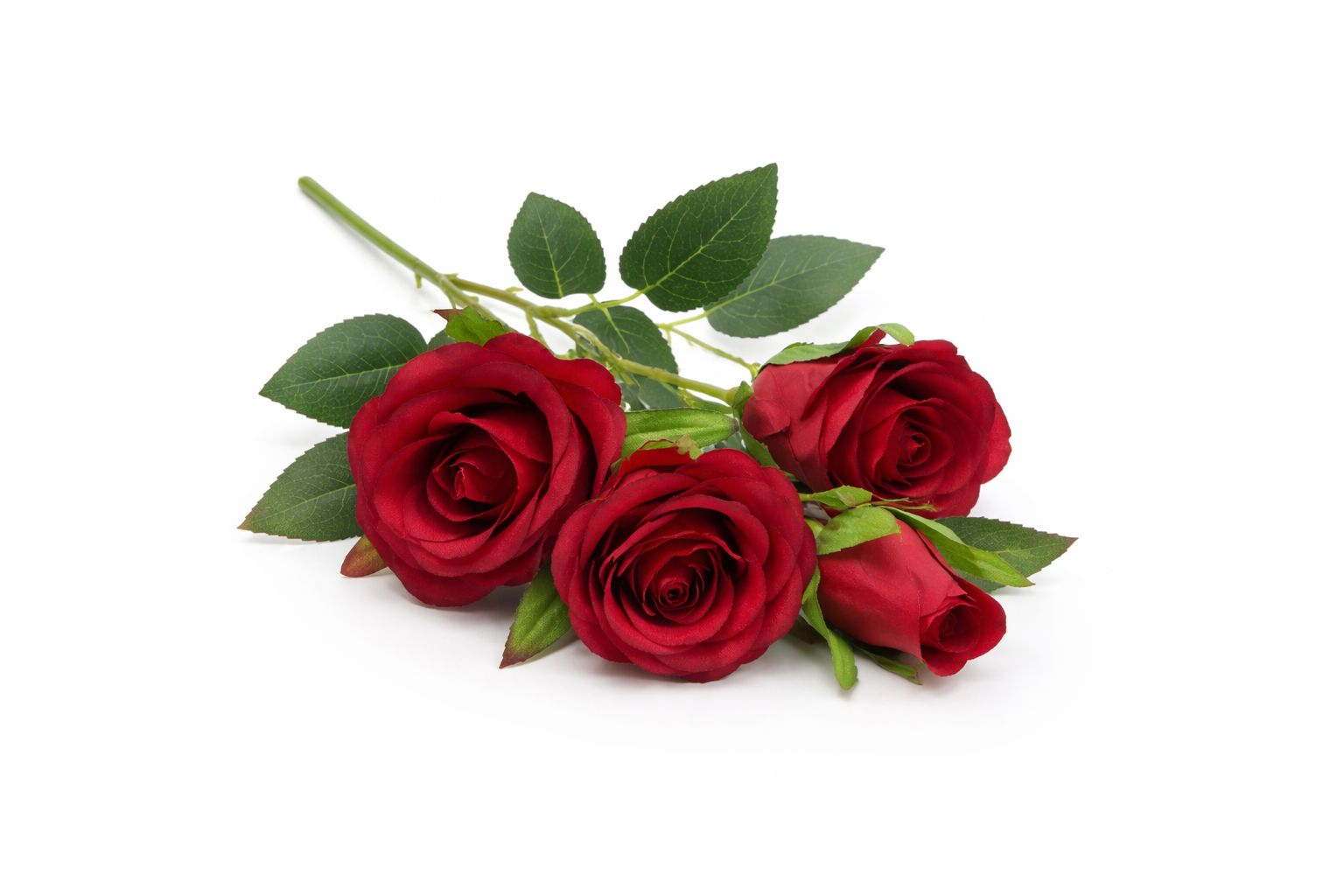 Set decorativ cu 3 trandafiri rosii infloriti si 2 boboci, cu aspect natural. Ideal pentru aranjamente florale, decor interior si evenimente speciale.