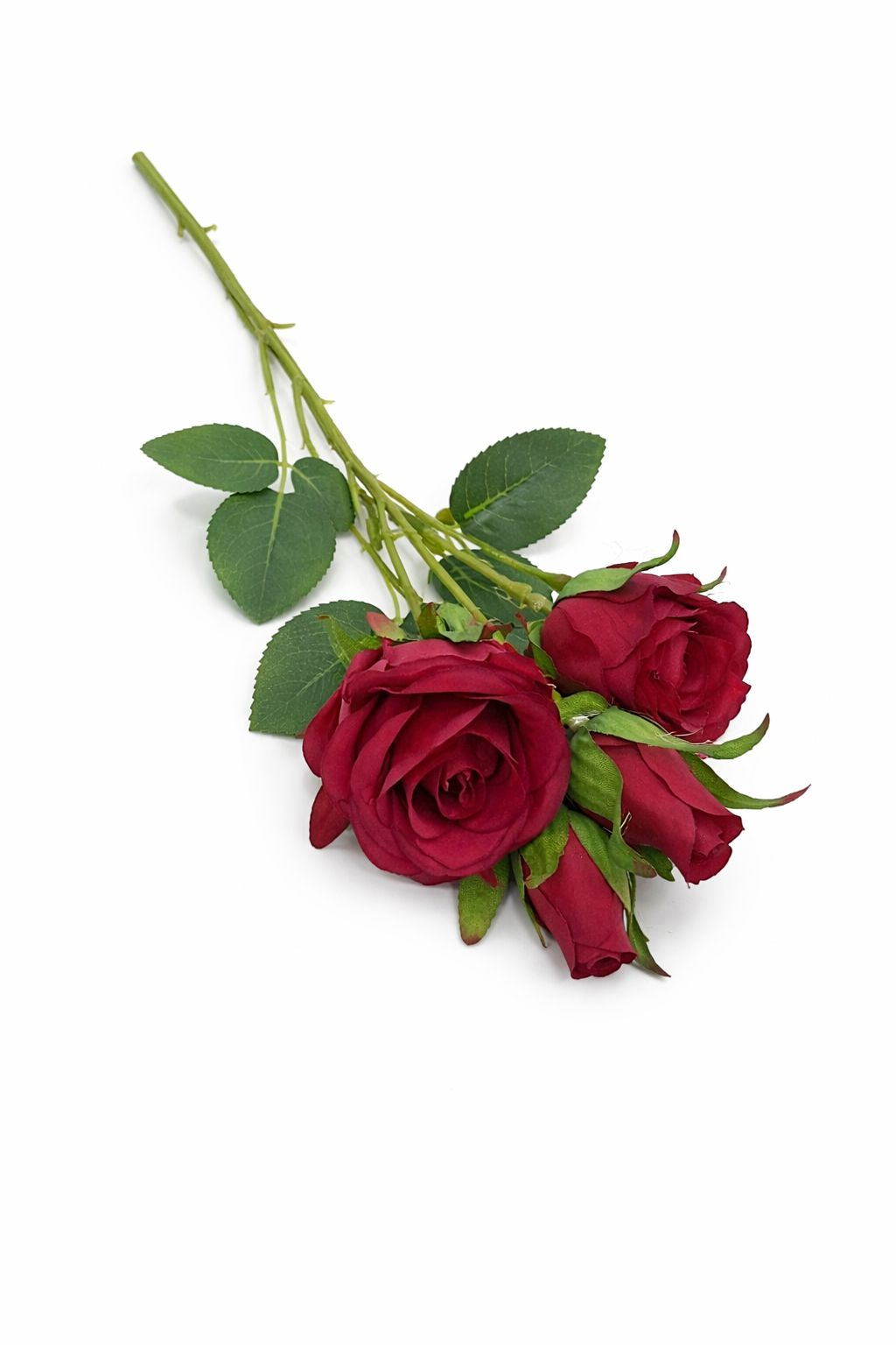 Adauga un plus de eleganta si rafinament decorului tau cu acest set format din 3 trandafiri infloriti si 2 boboci rosii, realizati artificial cu atentie la detalii. Florile au un aspect natural, cu petale fine si frunze verzi bine conturate, oferind un efect vizual realist si delicat.