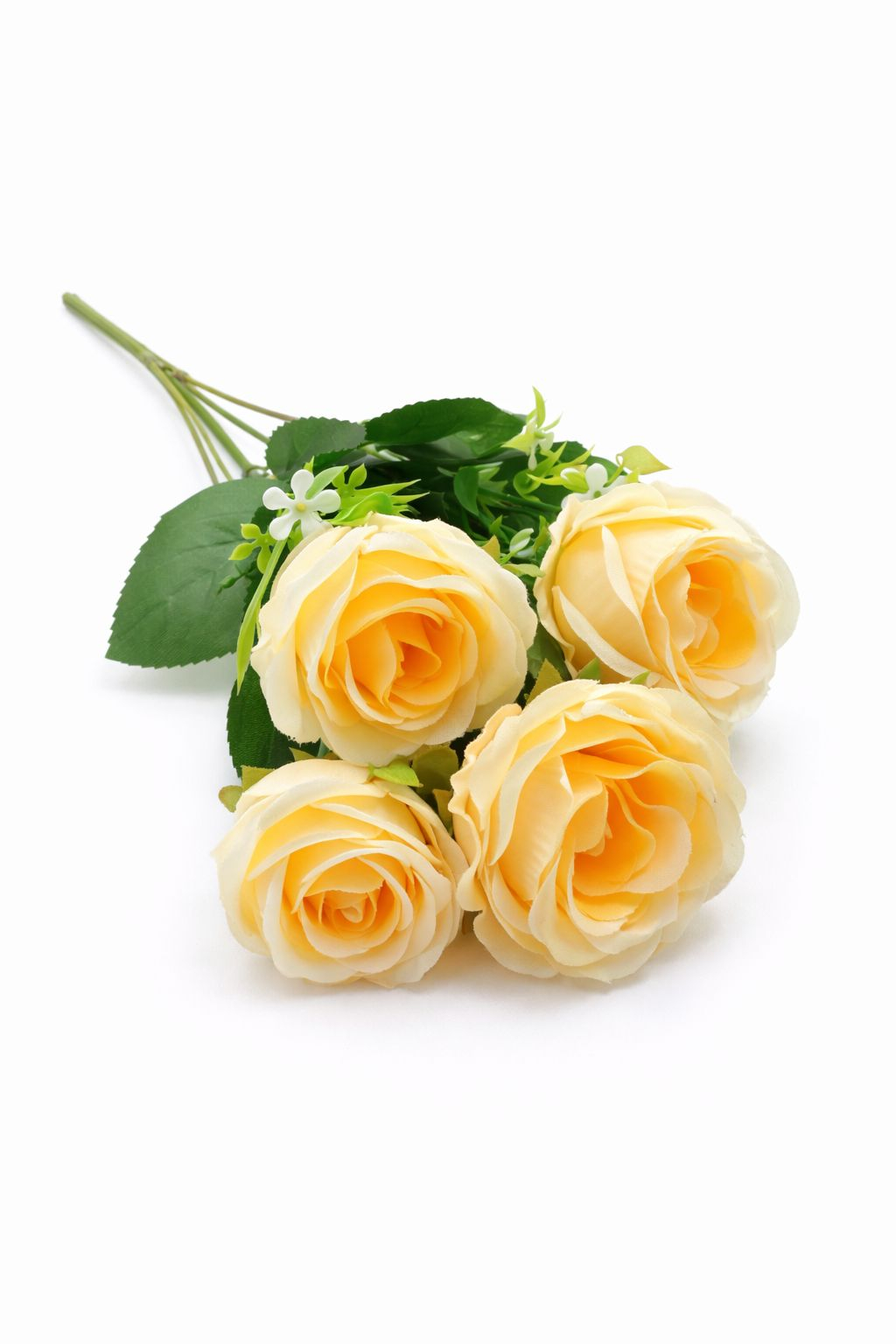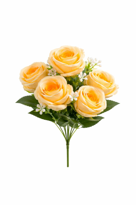 Adauga un plus de eleganta si rafinament decorului tau cu acest set format din 5 trandafiri infloriti galbeni, realizati artificial cu atentie la detalii. Florile au un aspect natural, cu petale fine si frunze verzi bine conturate, oferind un efect vizual realist si delicat.