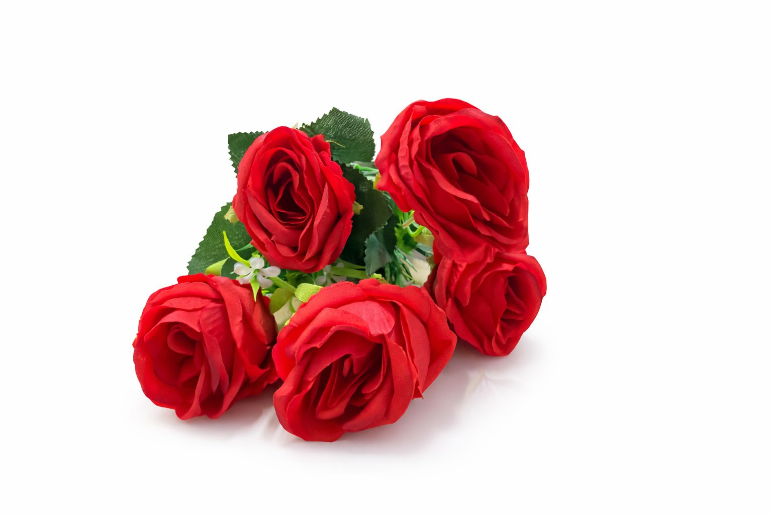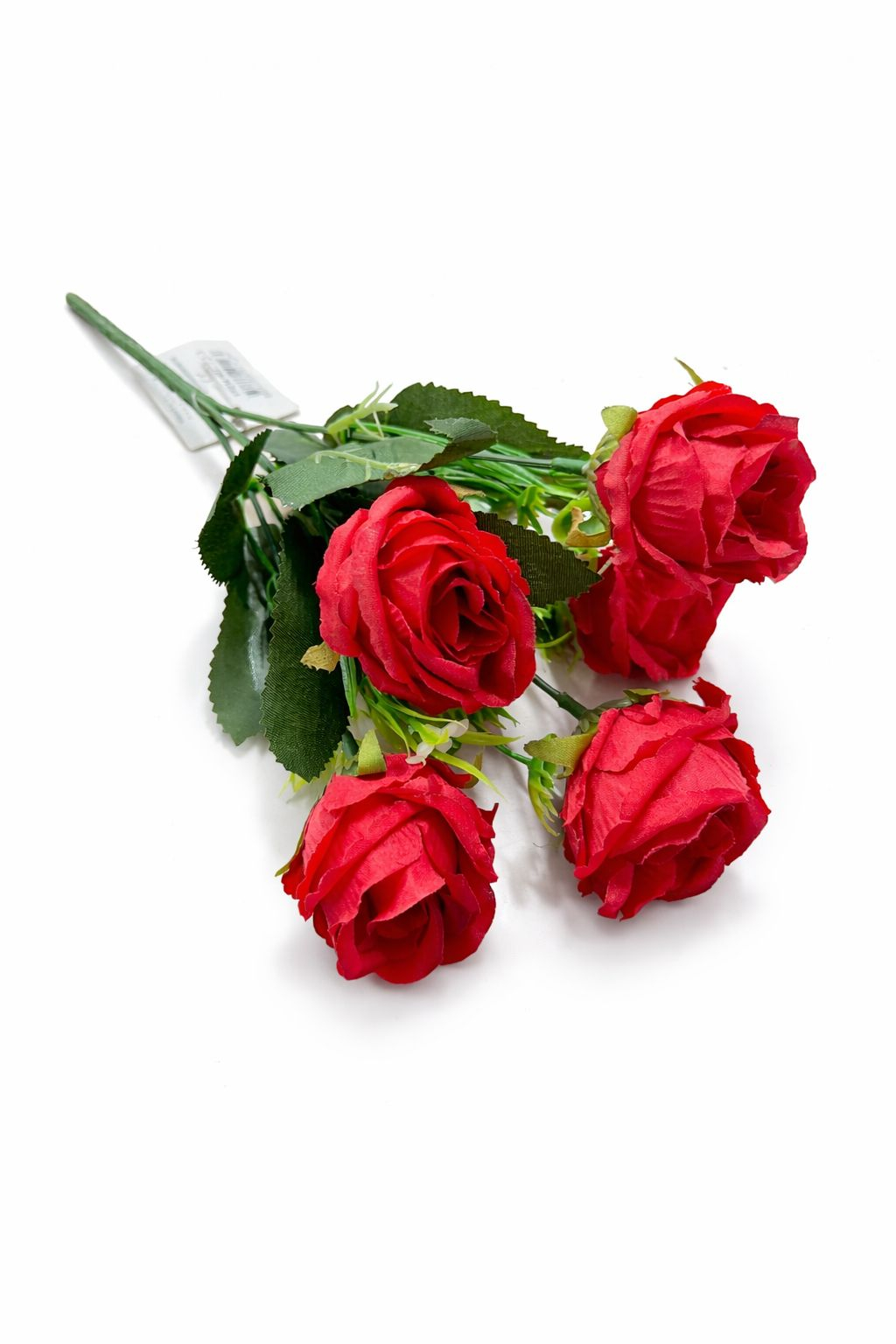 Set decorativ cu 5 trandafiri rosii infloriti cu aspect natural. Ideal pentru aranjamente florale, decor interior si evenimente speciale.