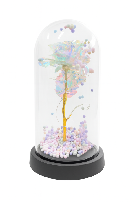 Un cadou spectaculos, cu un aer elegant si modern: acest aranjament decorativ prezinta un trandafir acrilic irizat, cu reflexii holografice ce isi schimba nuantele in functie de lumina. Cupola transparenta creeaza un efect vizual premium, iar bilele pastel confera un plus de delicatete si unicitate.