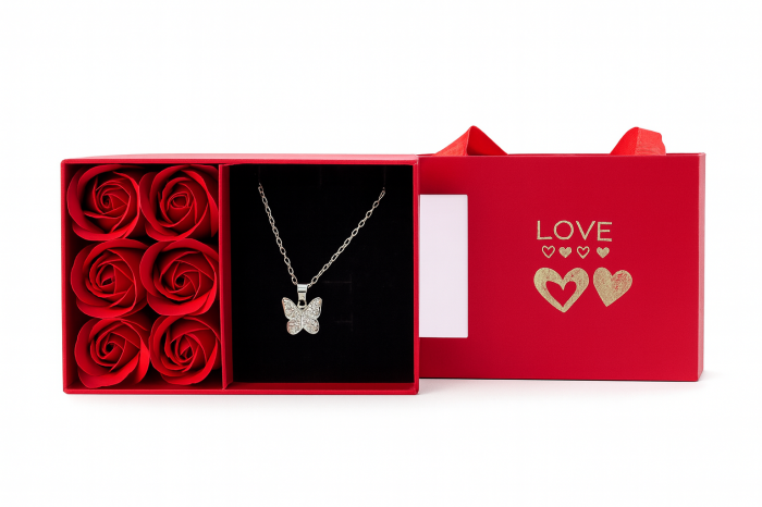 Cutia este realizata din carton rigid, cu finisaje elegante si inchidere tip sertar, fiind potrivita pentru cadouri romantice si ocazii speciale.