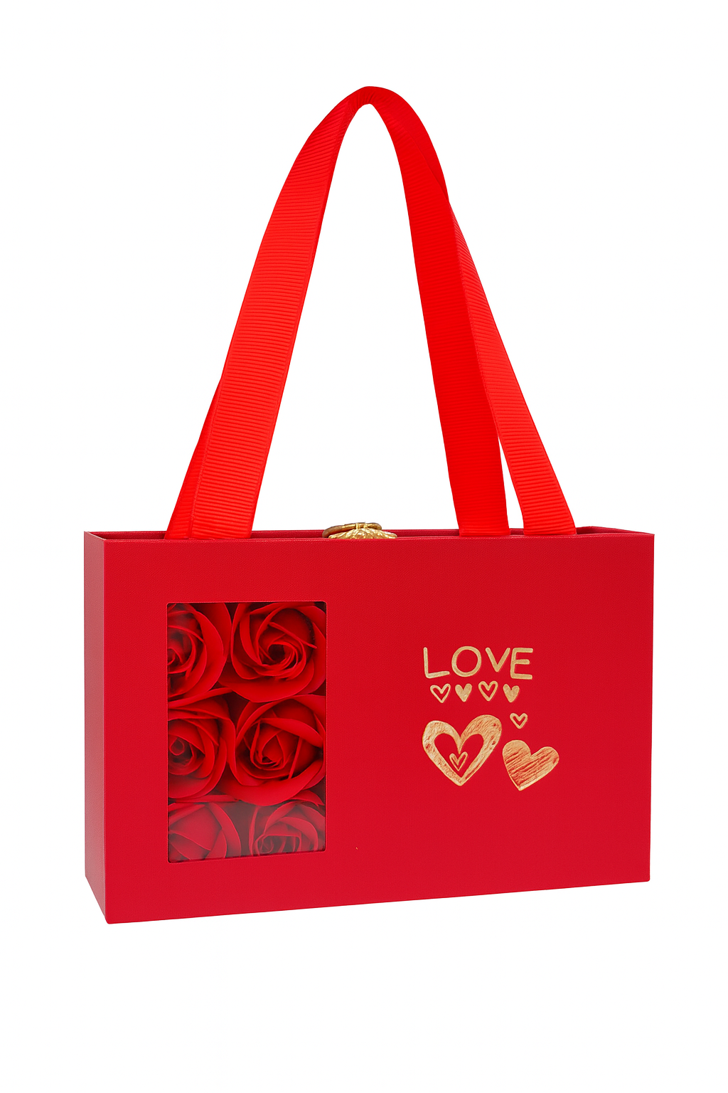 Cutie cadou tip punga 15x9.5x5 cm cu 6 trandafiri de sapun rosii si colier, model Love