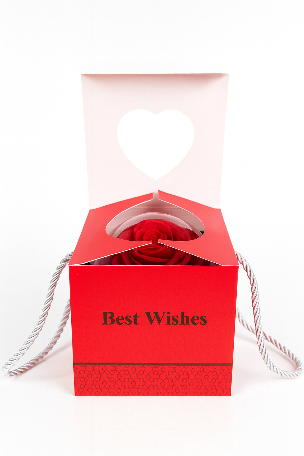 Un cadou care imbina eleganta, emotia si rafinamentul intr-o prezentare cu adevarat spectaculoasa. Cutia Best Wishes, in nuanta rosie intensa, ascunde sub cupola transparenta un trandafir din sapun, lucrat cu petale fine ce imita perfect o floare reala. Alaturi, intr-un compartiment dedicat, se afla un colier delicat, gandit sa straluceasca discret si sa aduca un plus de magie momentului oferirii.