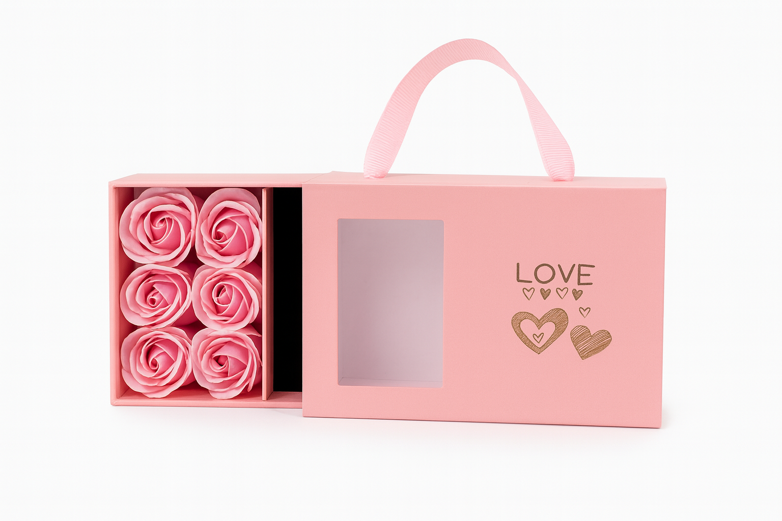 Set cadou cu 6 trandafiri de sapun roz, cutie roz tip poseta cu fereastra, 15x9.5x5 cm