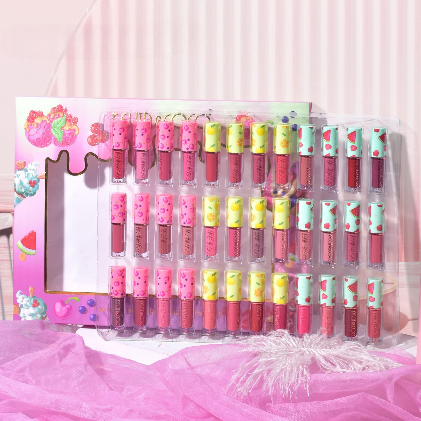 Set de Buze, KEVIN & COCO, 36 Lip Gloss-uri, Model Capac cu Fructe, 32.3 x 24.3 x 2.4 cm, Multicolor
