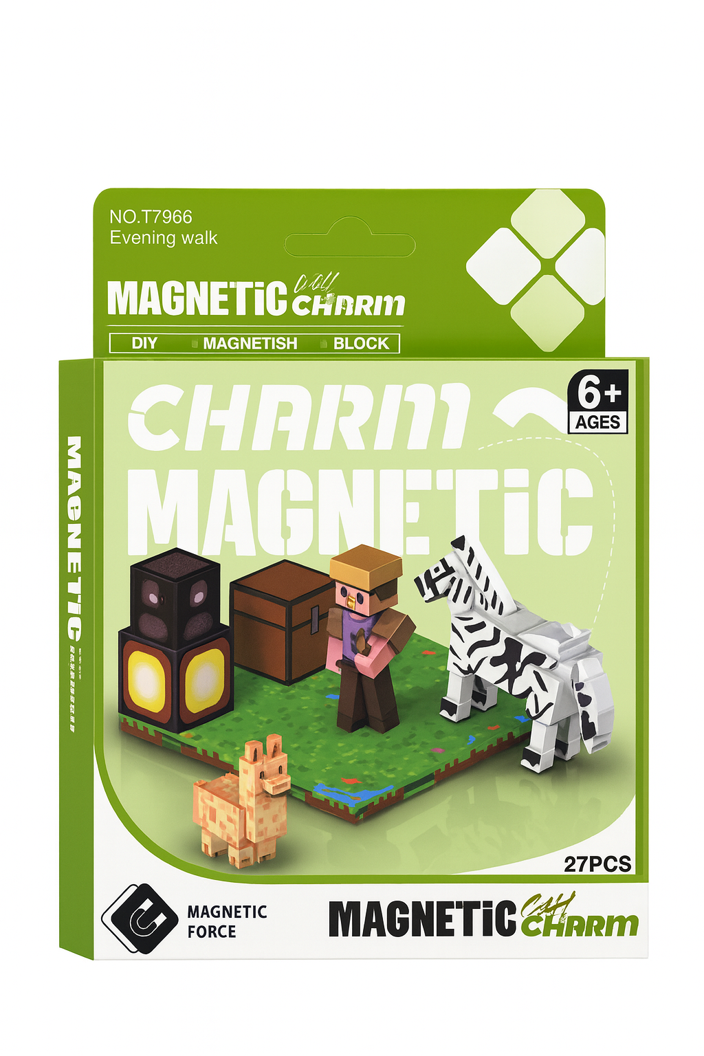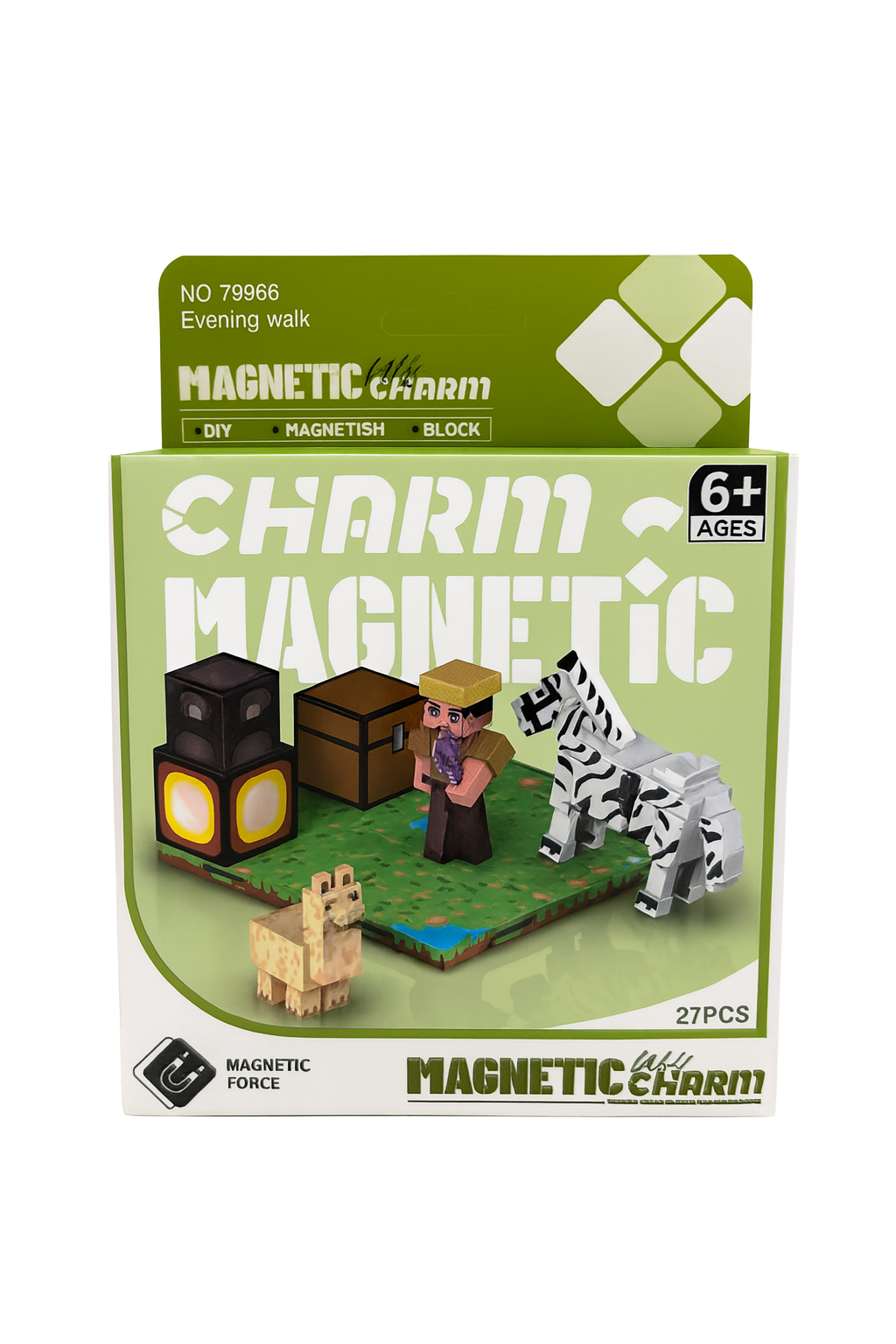 Setul Magnetic Charm – Evening Walk este ideal pentru copiii pasionati de universul pixelat si de scenarii creative. Cu 27 de piese magnetice, cei mici pot recrea o scena de plimbare seara, cu personaje, animale si elemente de decor inspirate din stilul Minecraft.