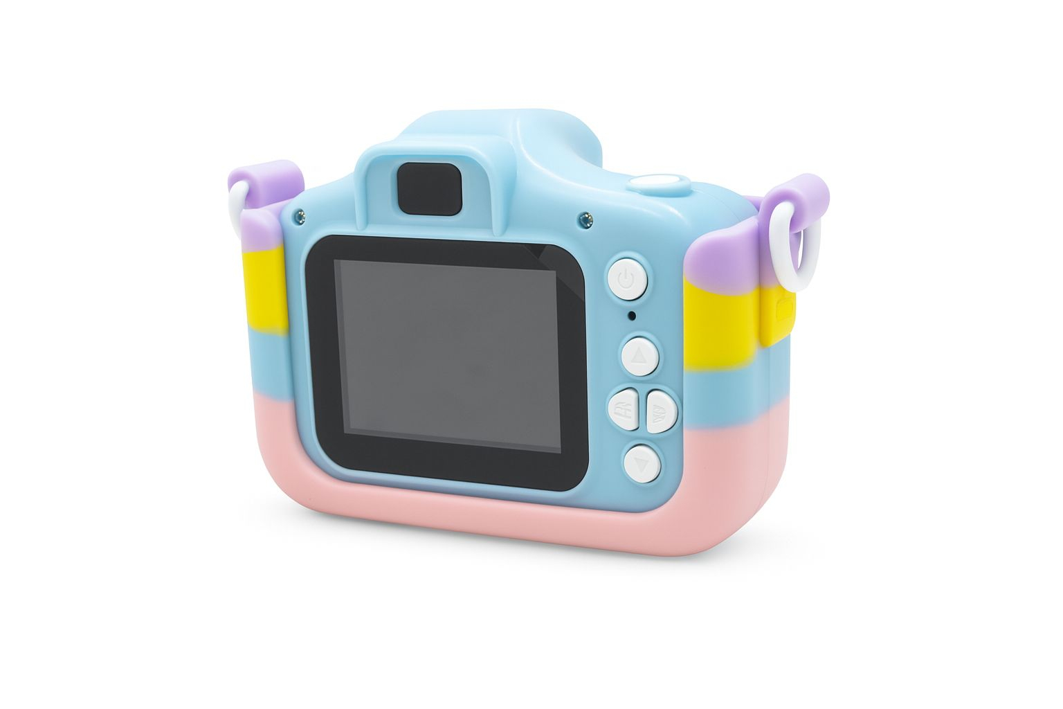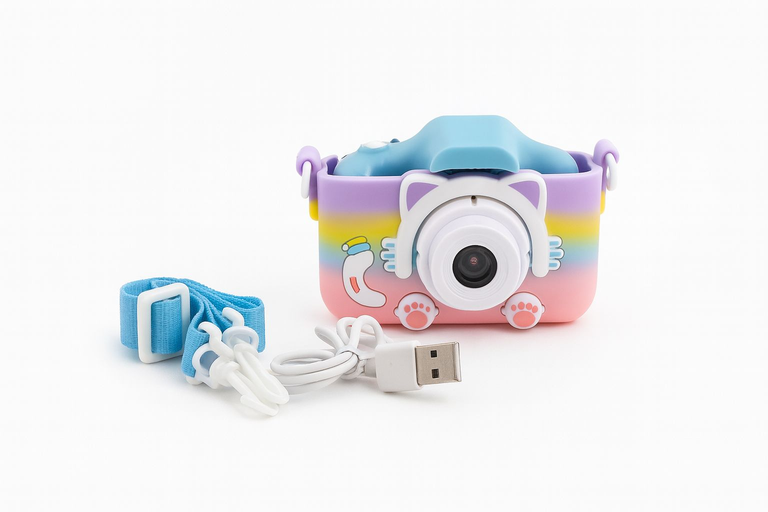 Camera foto digitala pentru copii, cu corp albastru si husa curcubeu in forma de pisicuta, este un gadget vesel si sigur pentru micii fotografi. Carcasa din silicon moale protejeaza camera si ii ofera un aspect colorat, usor de indragit.