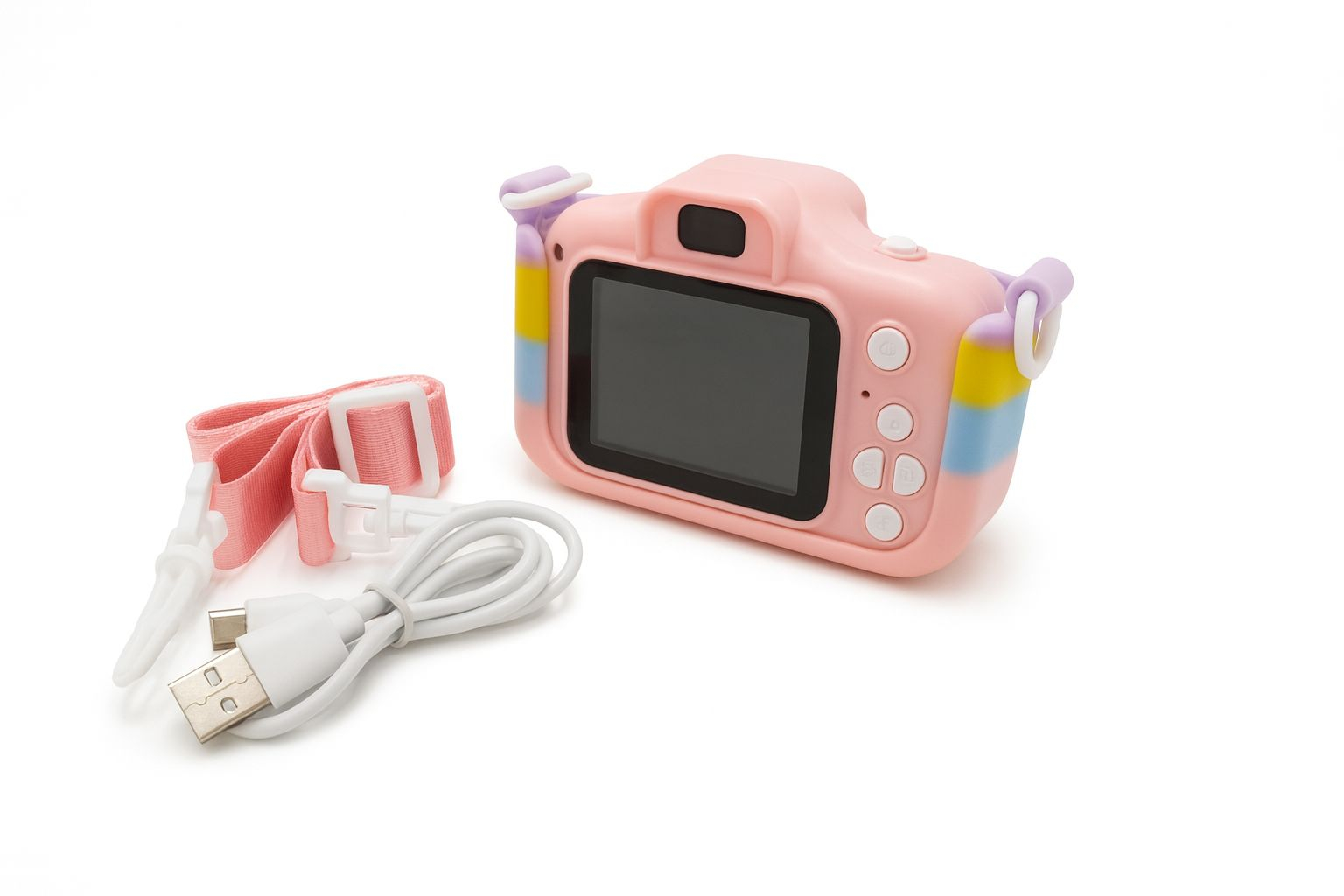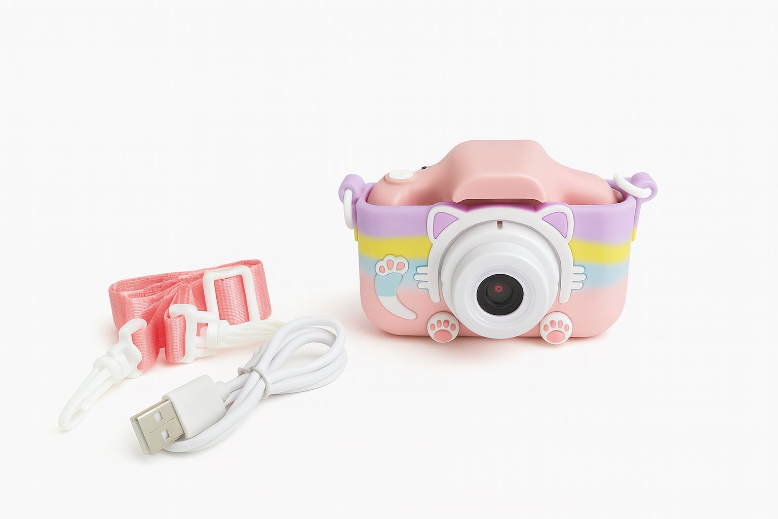 Camera foto digitala pentru copii, model roz cu husa curcubeu pisicuta, este ideala pentru micii exploratori care vor sa surprinda momente amuzante si creative. Carcasa din silicon colorat protejeaza aparatul si il face usor de manevrat.