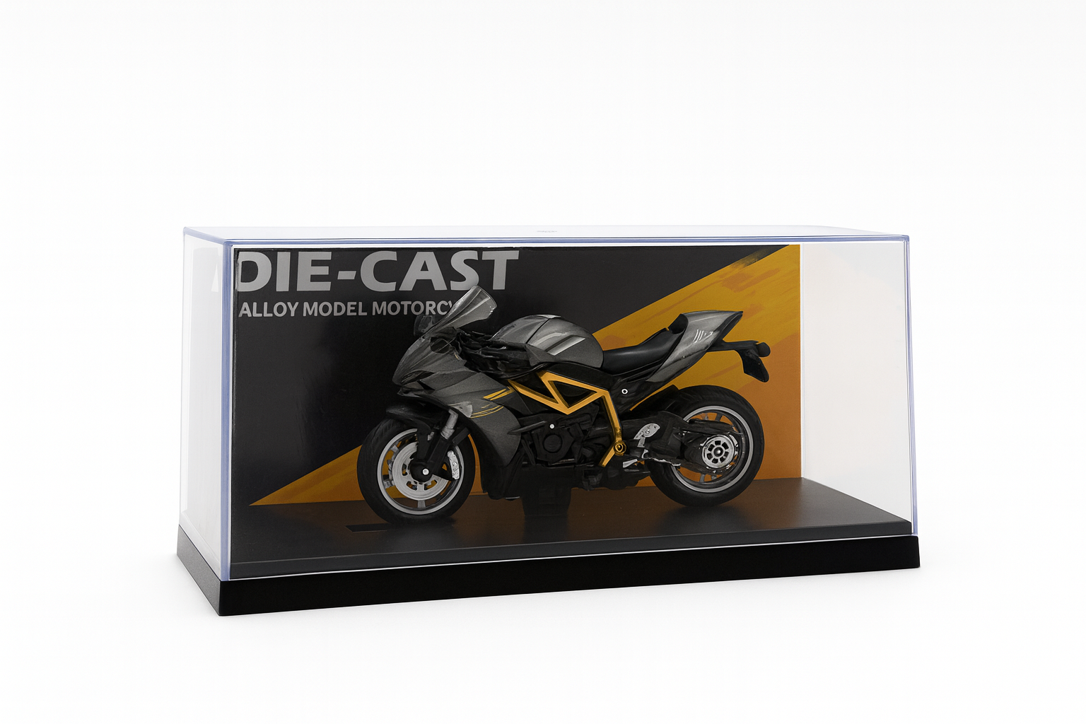 Adauga o piesa moderna si eleganta in colectia ta cu aceasta motocicleta die-cast sport, realizata din metal si detalii din plastic de calitate. Designul in nuante de gri si negru, completat de accente galbene, ii ofera un aspect agresiv si futurist. Motocicleta este prezentata intr-o vitrina transparenta premium, perfecta pentru expunere.