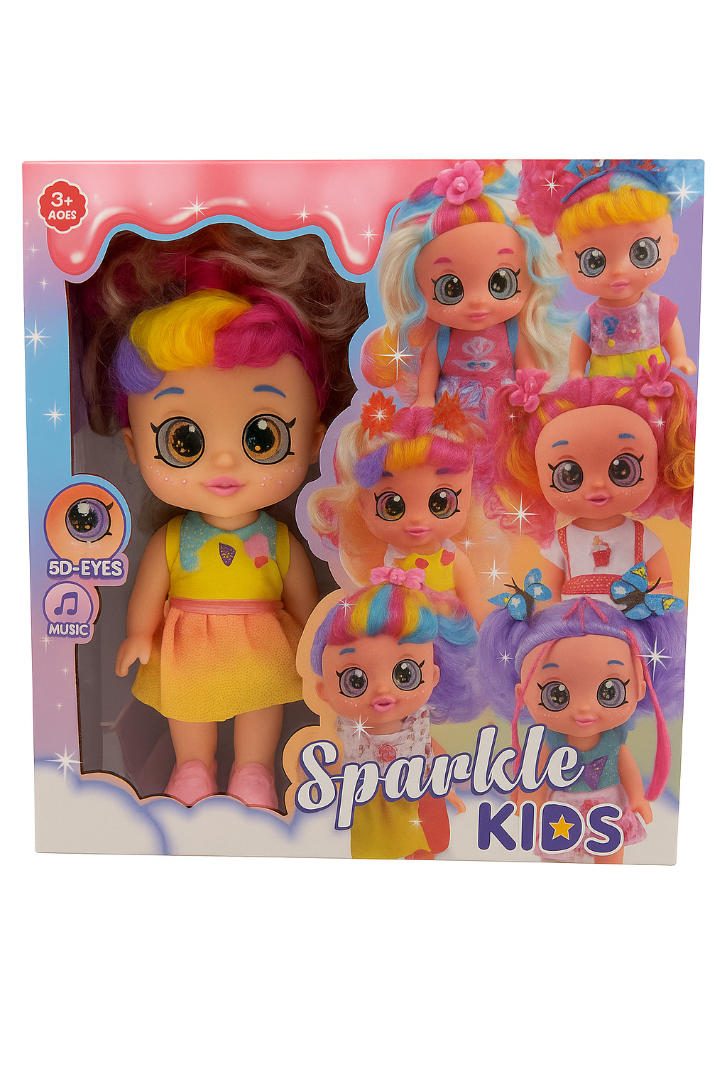 Papusa Sparkle Kids aduce magie, culoare si veselie in camera oricarui copil! Cu ochi mari tip SD-Eyes, expresivi si adorabili, si cu un par multicolor superb, aceasta papusa devine rapid preferata micutelor. Tinuta in nuante de curcubeu, combinata cu detalii jucause, creeaza o aparitie plina de energie si farmec.