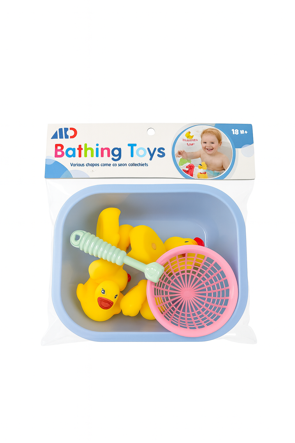 Transforma timpul de baie intr-o experienta distractiva cu acest set vesel de jucarii pentru copii! Setul include o mini-cadita din plastic, mai multe ratuste galbene plutitoare si o sita tip plasa cu maner, perfecta pentru joaca interactiva si pentru dezvoltarea coordonarii celor mici.
