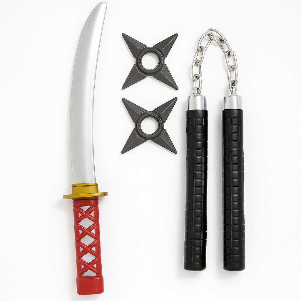 Setul include o sabie cu teaca, doua nunchaku si doua stele ninja din plastic rezistent, usor si sigur pentru copii. Fiecare piesa este atent realizata pentru a oferi o experienta de joaca cat mai realista, fara riscuri.