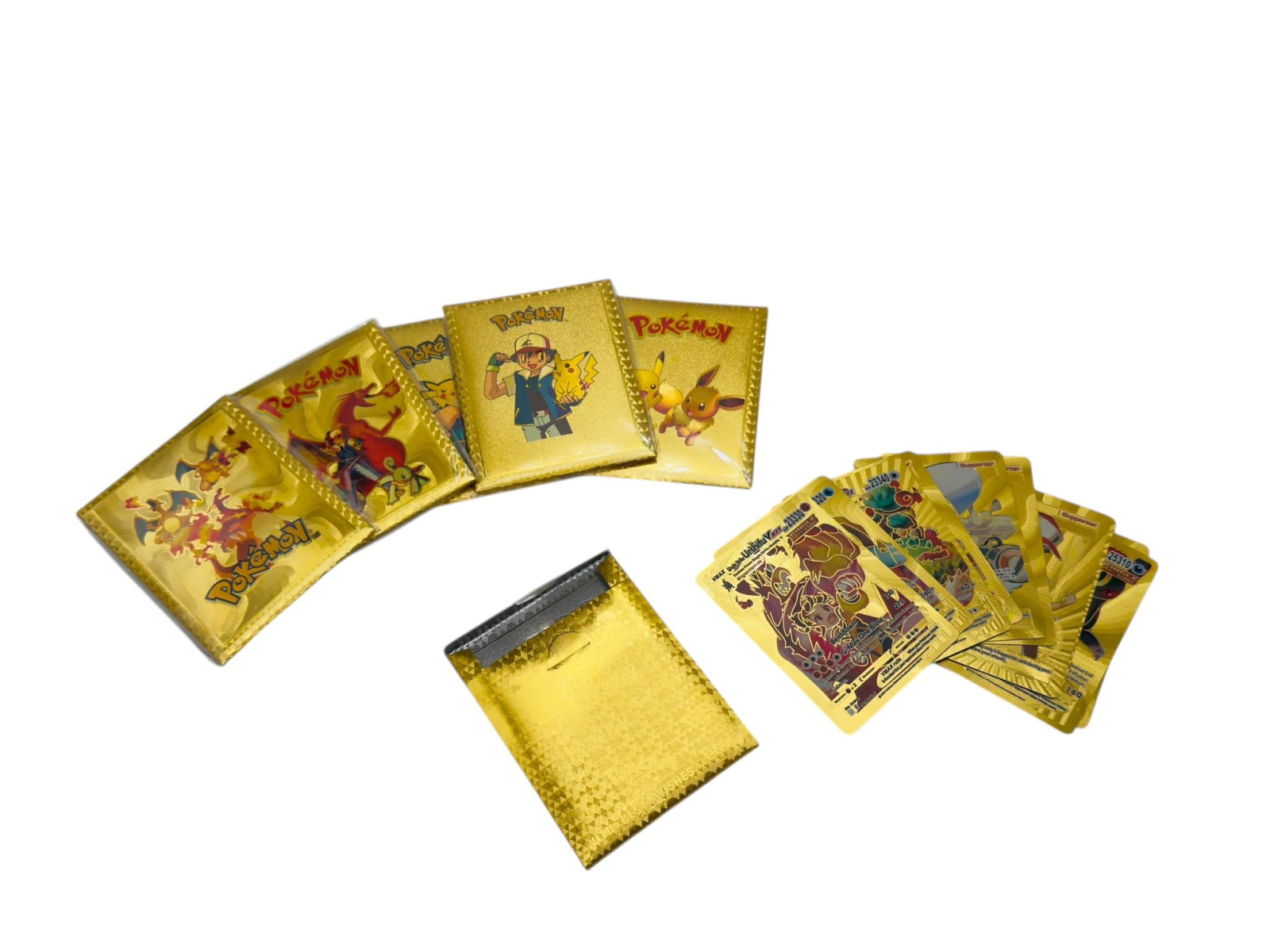 Descopera un set de carti de joc tematice cu un design unic, ideale pentru colectionari si fanii universului de creaturi de buzunar. Aceste carti atragatoare au un finisaj complet auriu (gold foil), oferind un aspect stralucitor si premium. Sunt fabricate din material PVC de inalta calitate, ceea ce le face impermeabile (waterproof), durabile si rezistente la uzura in comparatie cu cartonul obisnuit.